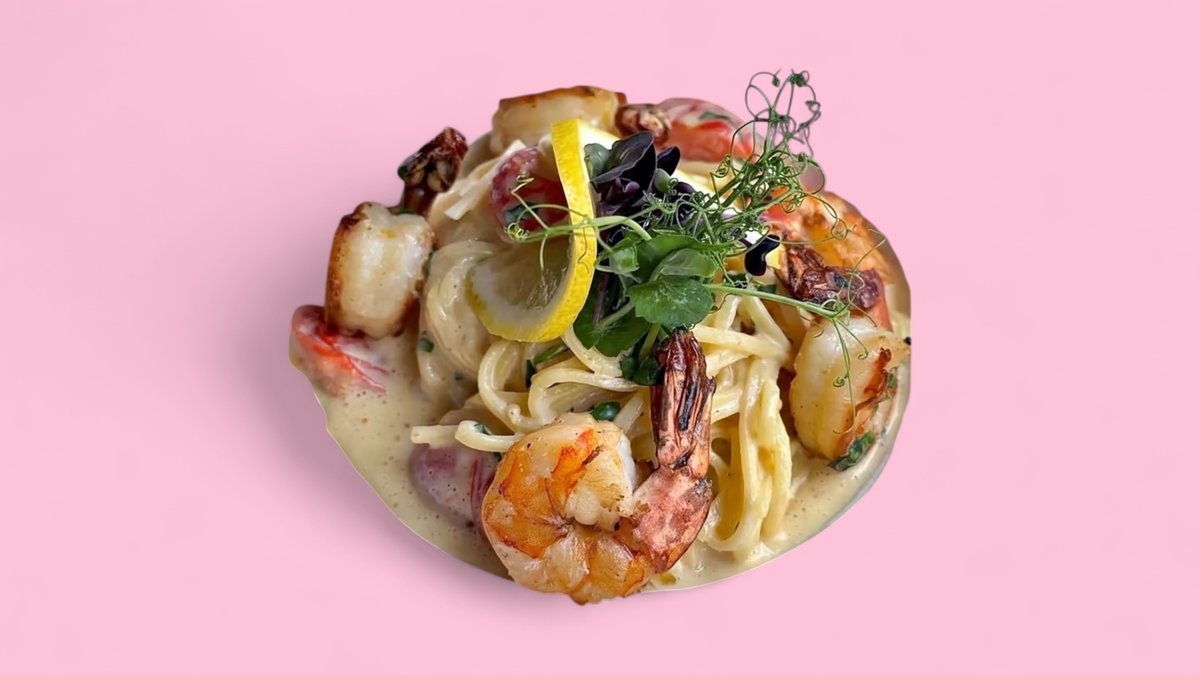 Linguine with prawns, lemon-parmesan sauce, cherry tomatoes and parsley