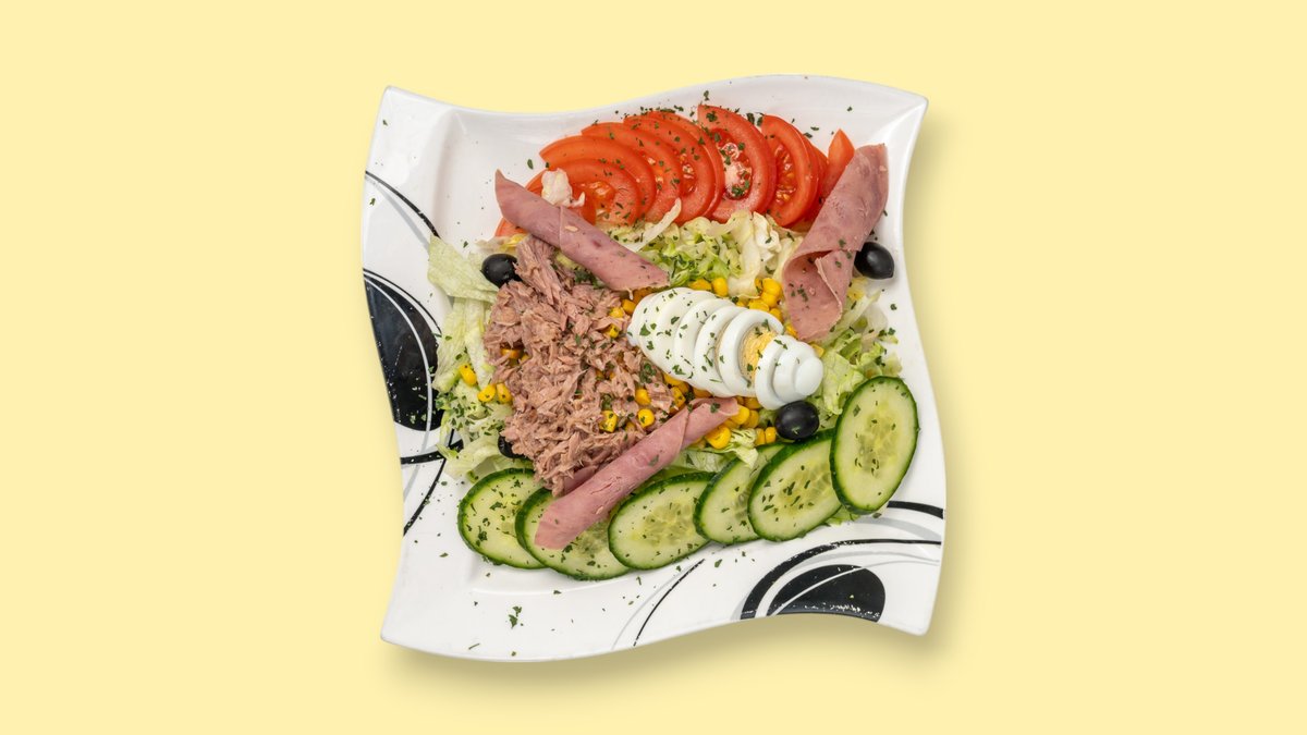 with iceberg lettuce, tomatoes, cucumbers, egg, corn, olives, tuna, ham, bread rolls and a dressing of your choice