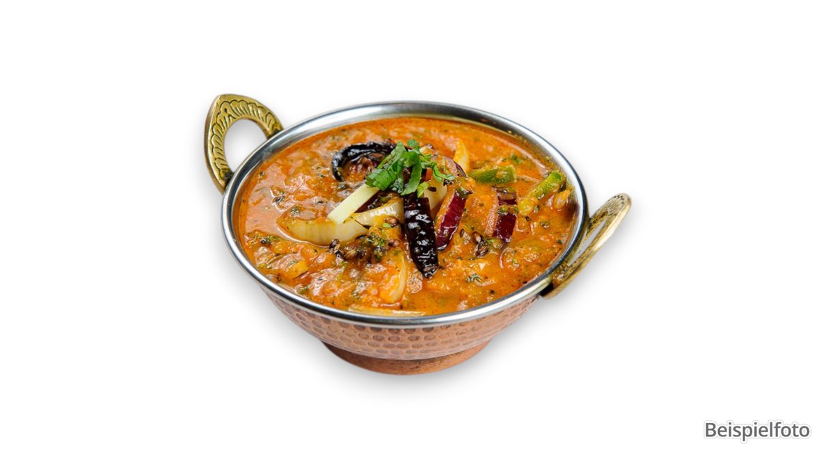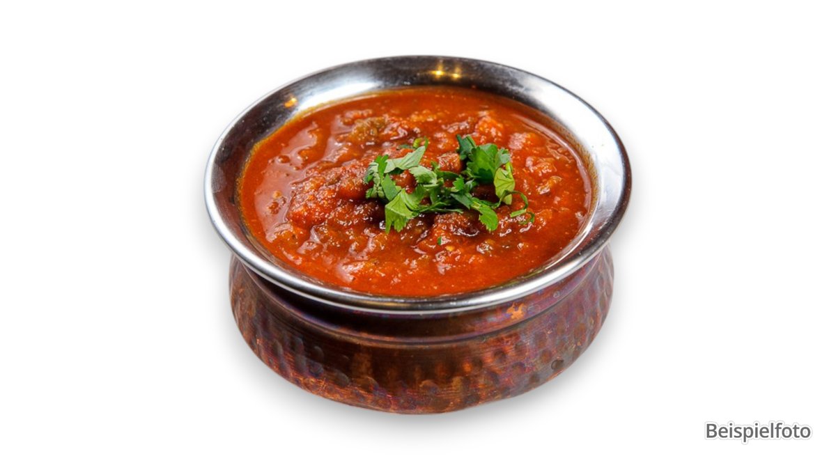 sehr pikant Hähnchenfleischstücke, zubereitet in einer scharfen Soße mit frischen Tomaten, Paprika, Zwiebeln, zerstoßenem rotem Chili und Koriandersamen