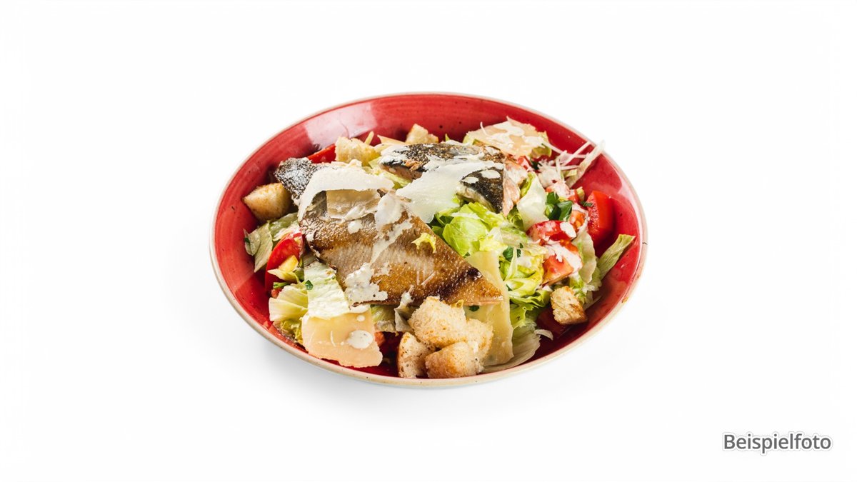 gegrilltes Lachsfilet auf knackigem Romana Salat mit Gurken, Tomaten, Mais, Paprika und roten Zwiebeln