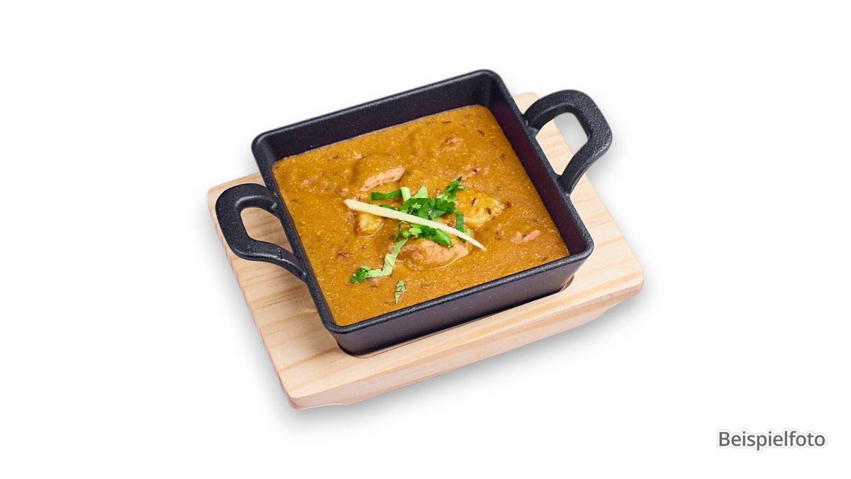mariniertes und im Tonofen gegrilltes Hähnchenfleisch (Chicken Tikka), gegart in würziger Soße aus Tomaten, Zwiebeln, Sahne und Masala-Gewürzmischung