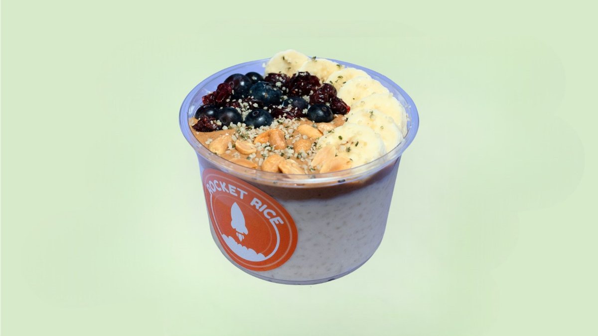 with 30g protein powder, bananas, peanut cream, peanuts, berries and hemp seeds