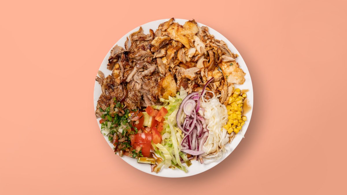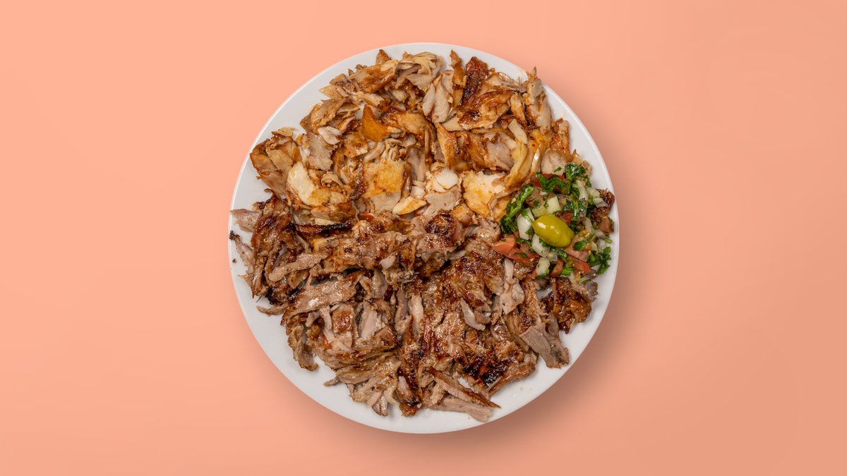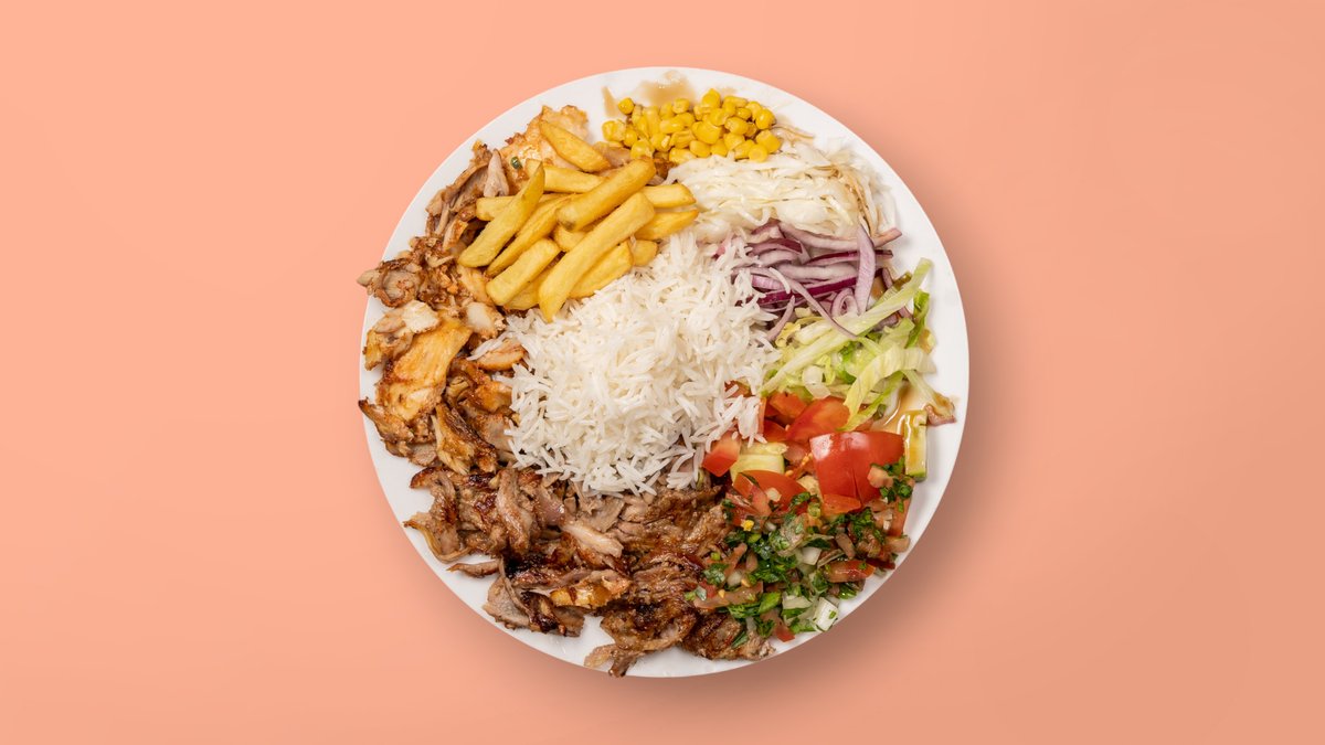 mit 1x gehacktem Lammfleisch, 1x gemischtem Lamm, Hähnchenspieß, 1x Lammkotelett, 1/2 Hähnchenkeule, gegrillten Tomaten, Peperoni und einer Beilage deiner Wahl