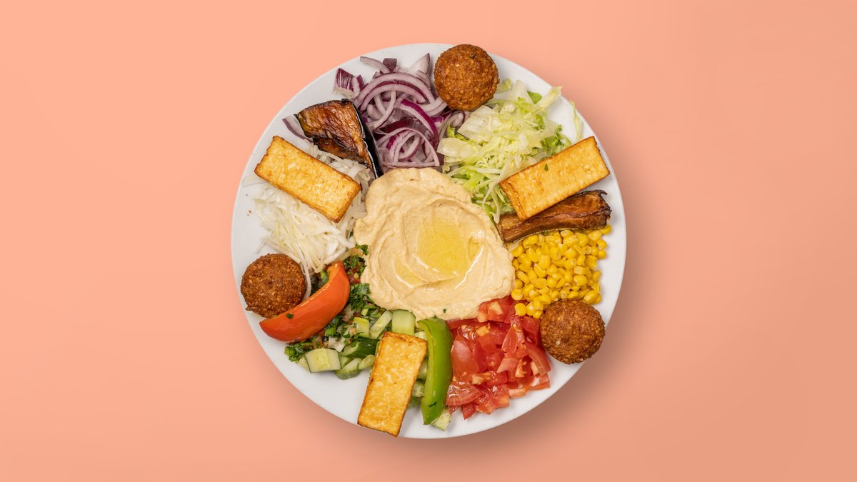 mit 3x Falafel, 3x Halloumi, gegrillten Auberginen, Hummus, Salat und Soße