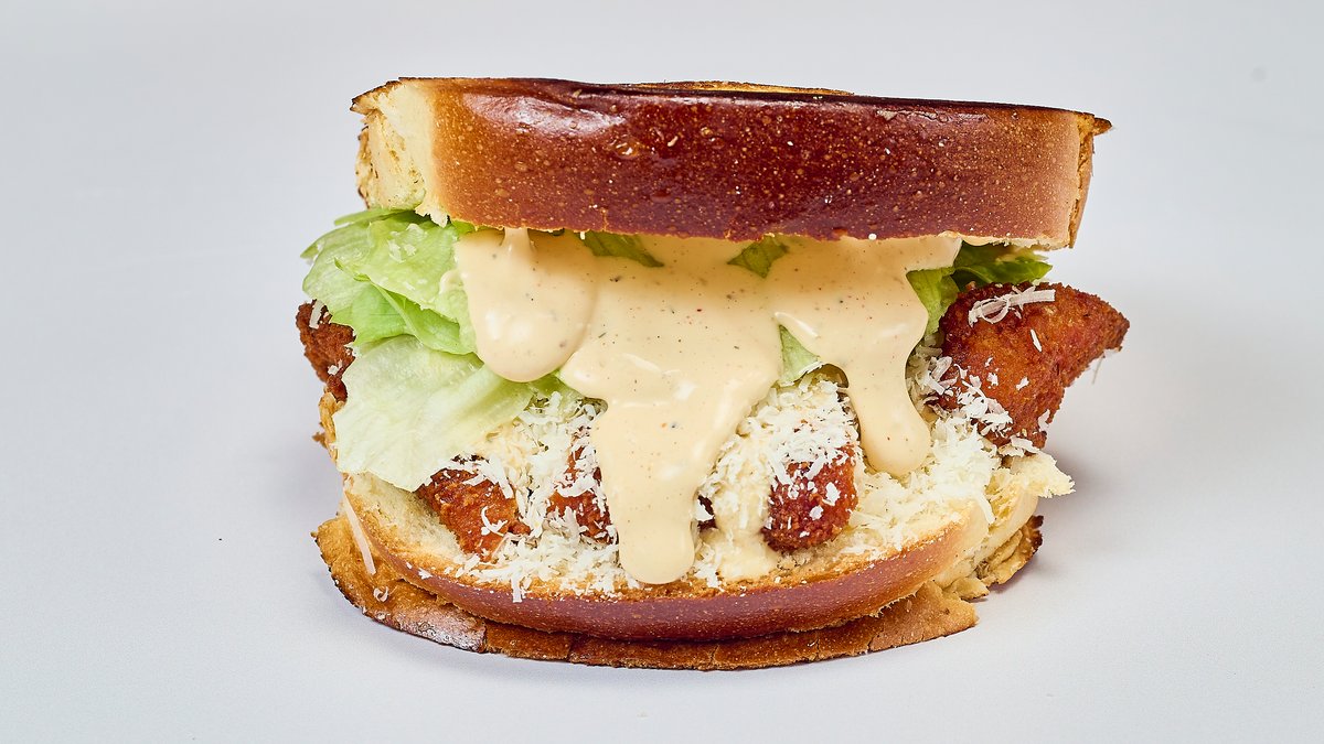 delicious homemade brioche bun with breaded chicken breast fillet, iceberg lettuce, garlic sauce and Parmesan