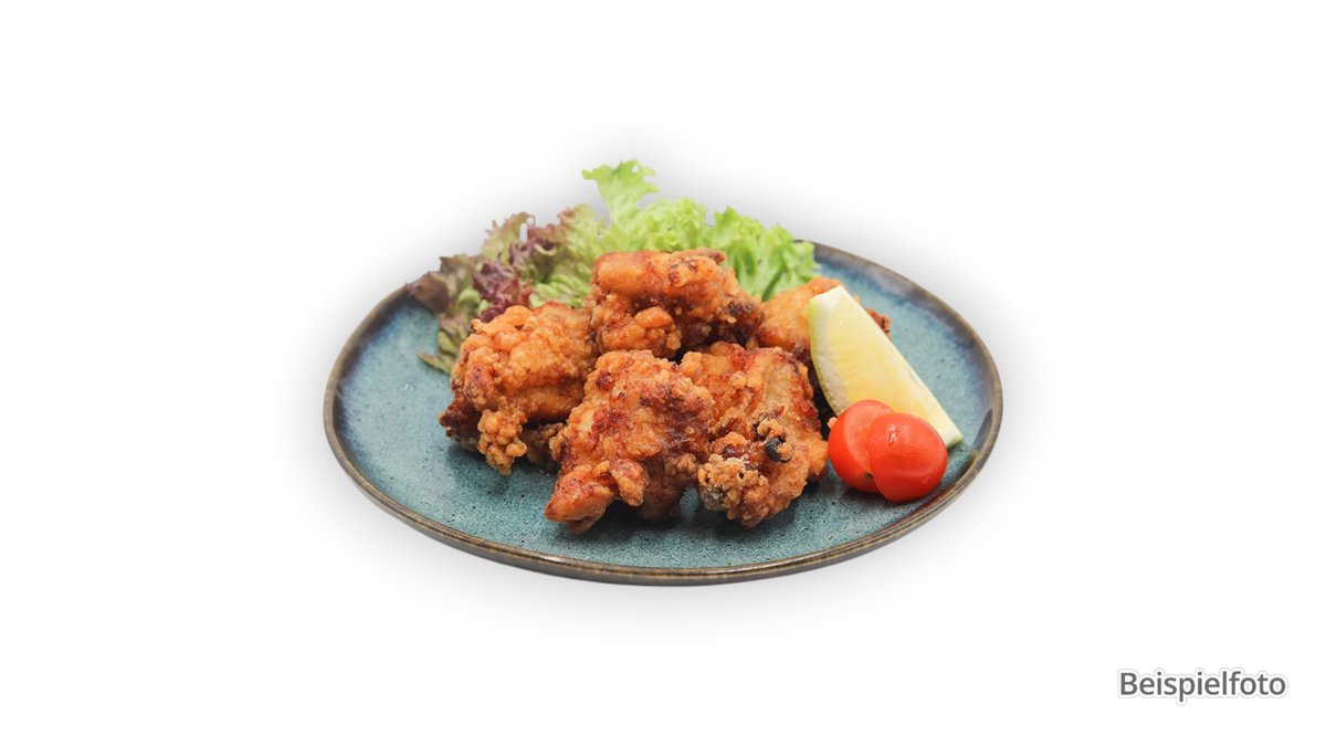with salmon sashimi, fried chicken, sweet chili sauce, 6 uramaki, 1 nigiri, various side dishes and salad
