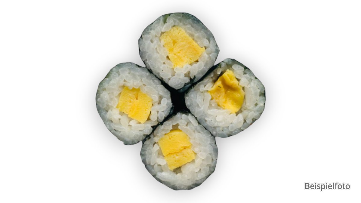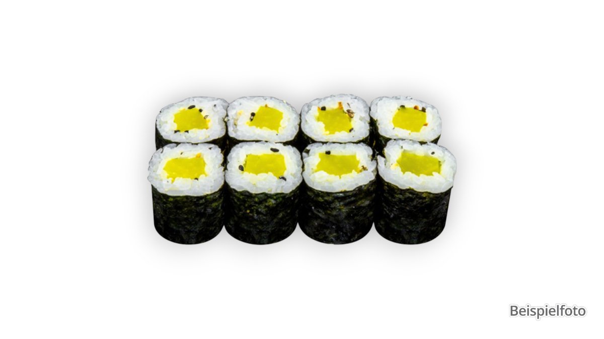 with tamago inari, fried nigiri, 3 avocado, 3 cucumbers, 3 pickled radishes and 3 pickled pumpkins