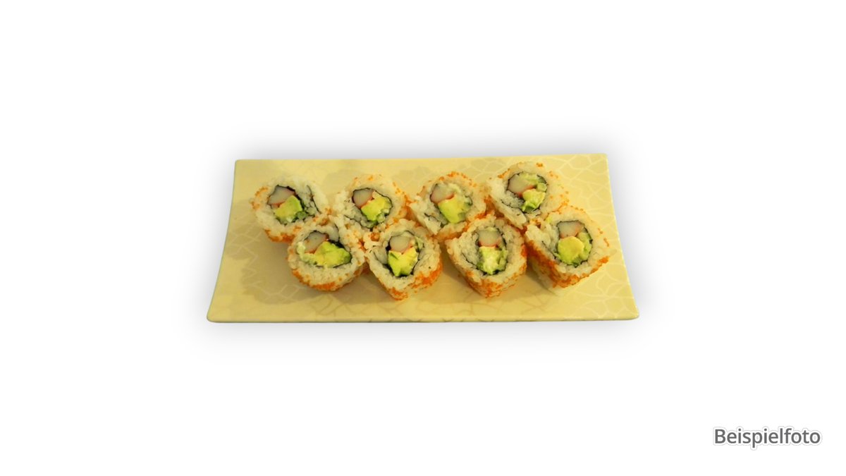 8 pieces Sake Avocado Inside Out 1 pieces sake 1 pieces maguro 1 pieces ika 1 pieces tako nigiri
