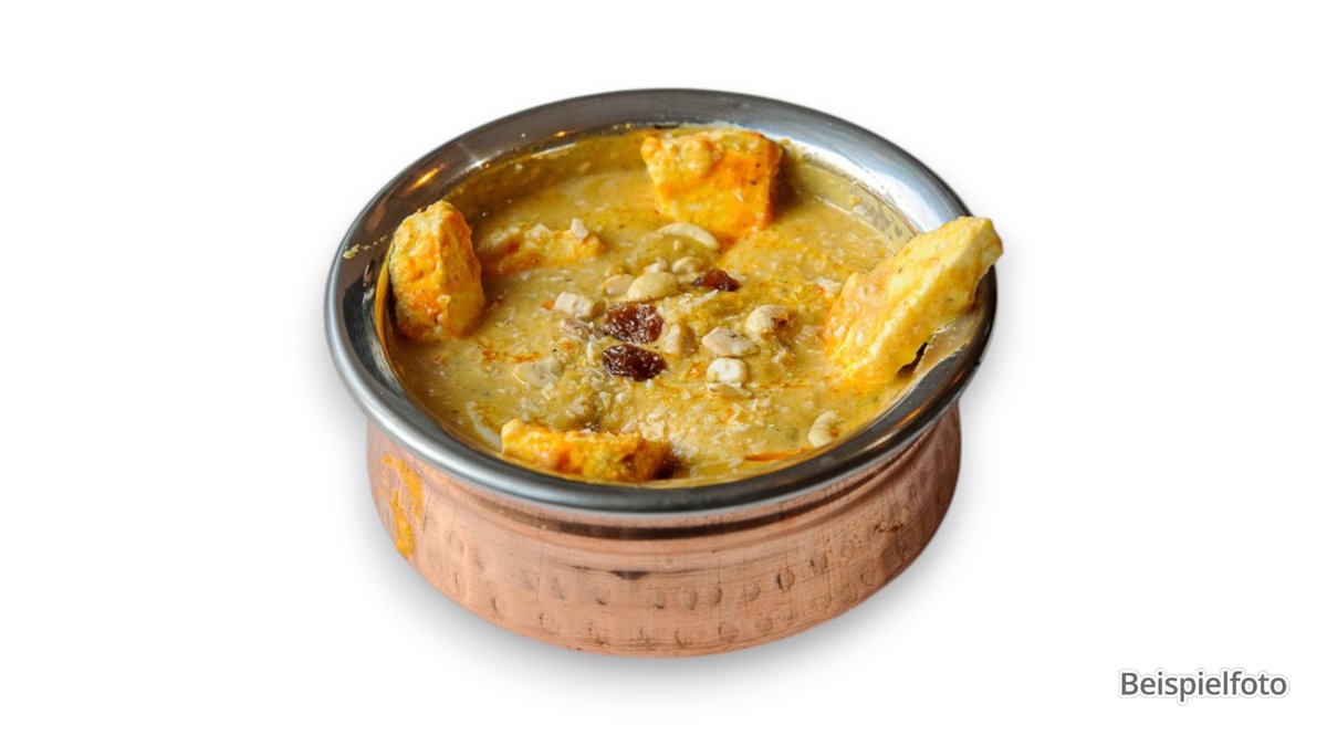 homemade cottage cheese with coconut, almonds, raisins in a creamy curry sauce