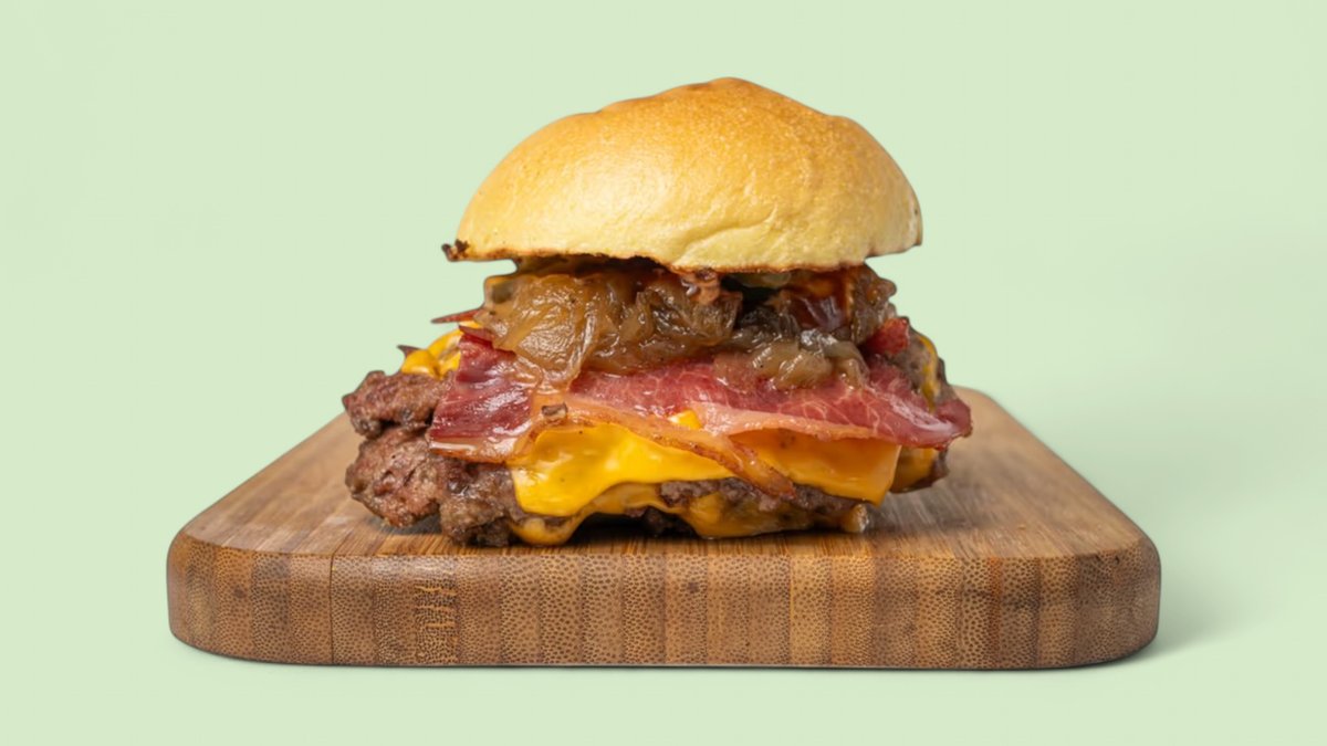 with two smash patties, double Cheddar cheese, burger sauce, grilled onions and pickles