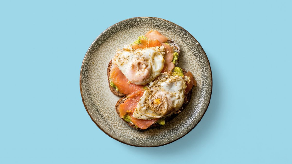 with 2 slices of bread, cream cheese, avocado, smoked salmon, rocket, sesame and 2 fried eggs