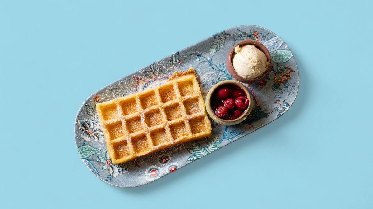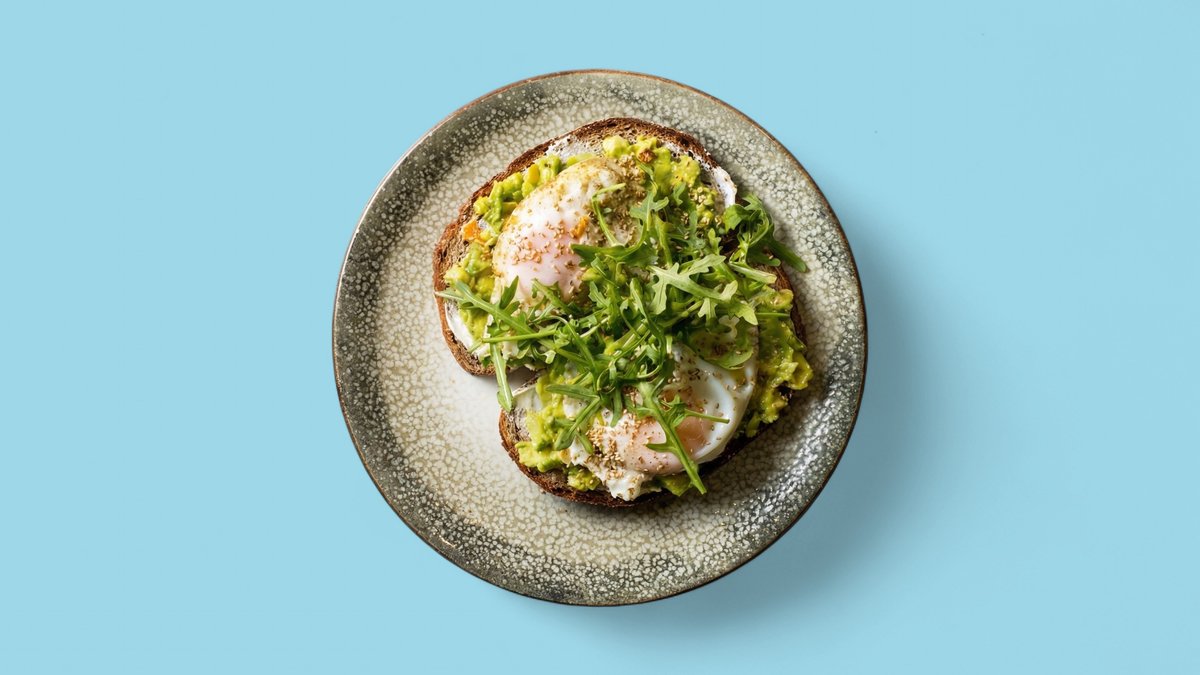 toasted croissant with cream cheese, avocado, fried egg, rocket and Parmesan