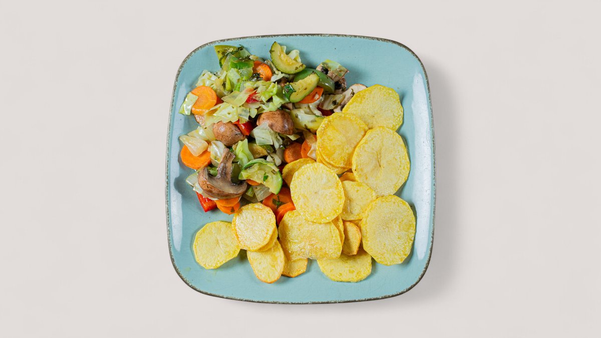 gemischte Gemüsepfanne mit frischen Pommes frites