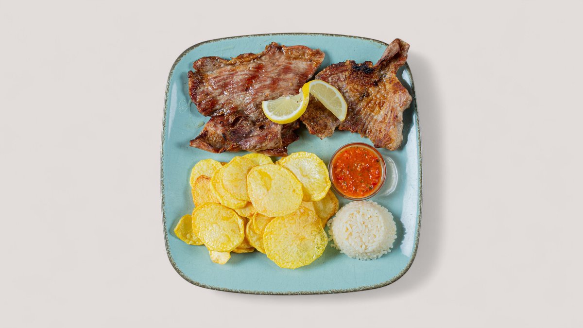 alle Gerichte werden mit frischen hausgemachten Kartoffelchips und Reis gegrillt