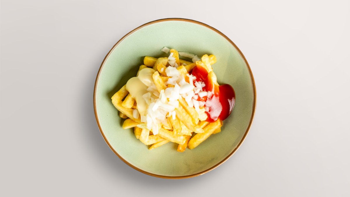 mit Pommes-Creme, Ketchup und rohen Zwiebeln