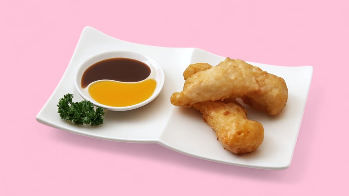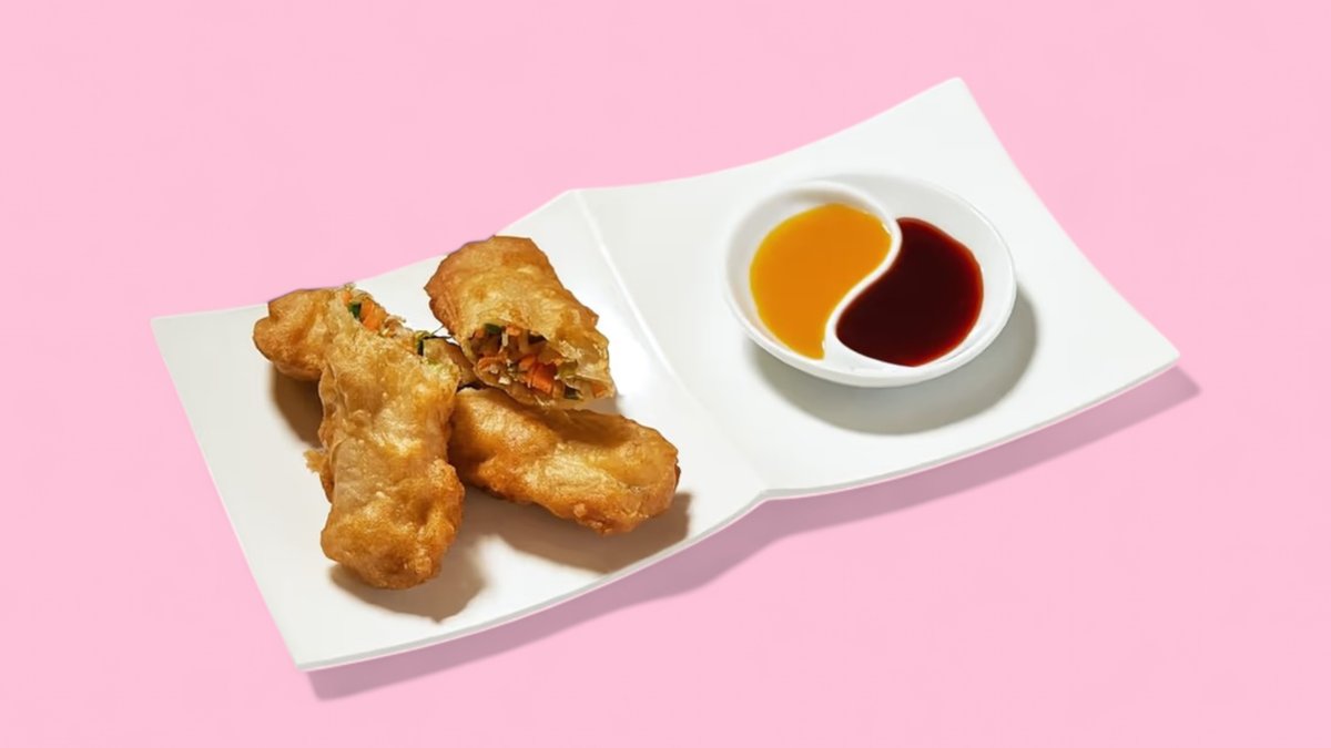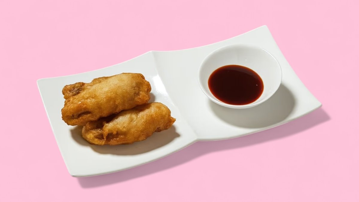 2 Stück, knusprig gebacken mit Mais, Paprika, Ingwer und Koriander gefüllt und süßer Chili-Dip