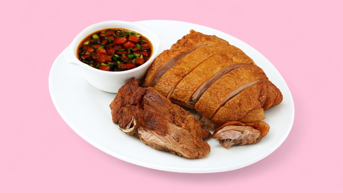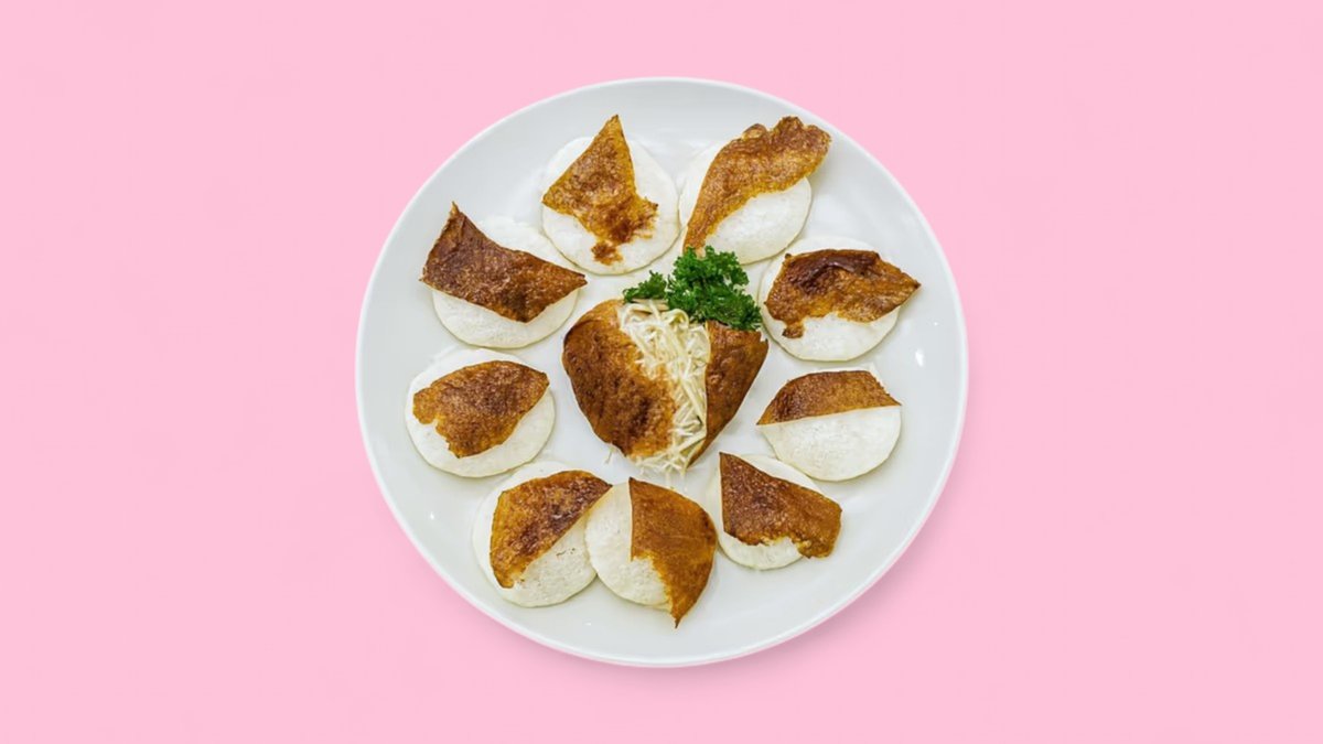 knusprig gebacken mit Schweinefleischfüllung und Süß-Sauer-Dip