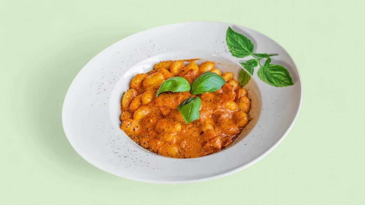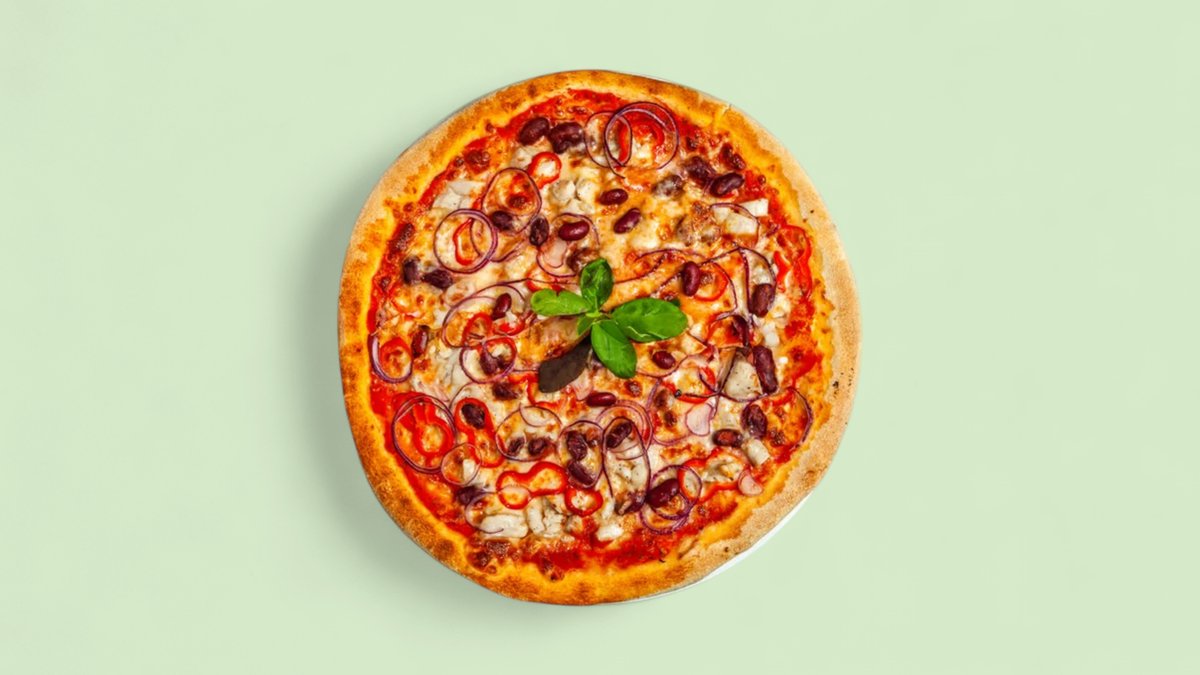 scharf mit Formfleischvorderschinken, roten Zwiebeln und Basilikum-Tomatensoße
