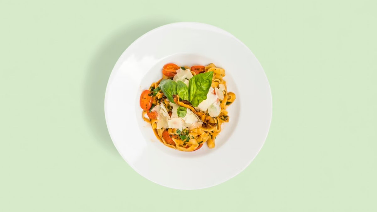 mit Formfleischvorderschinken, Erbsen, Champignons und Tomaten-Sahnesoße