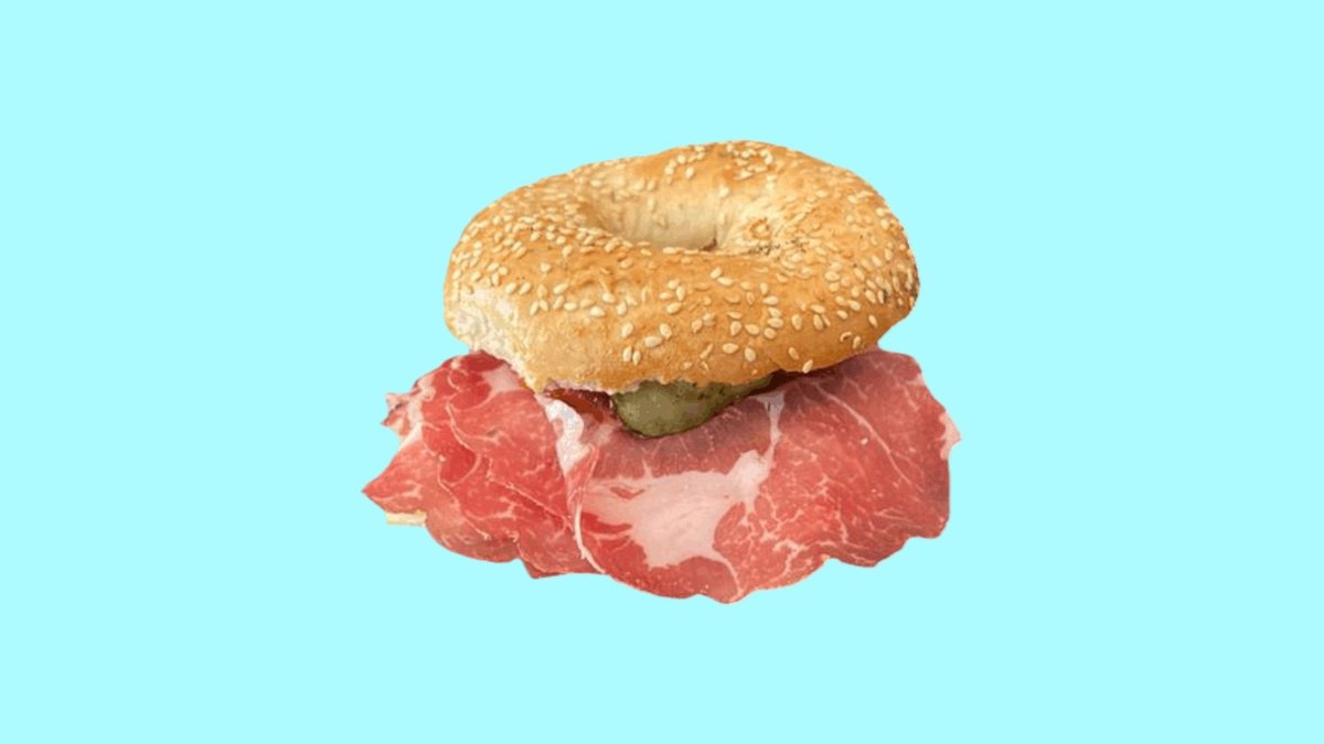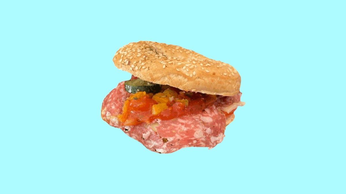 with dried salami from pork, cream cheese, tomatoes, lettuce, cucumbers and pesto