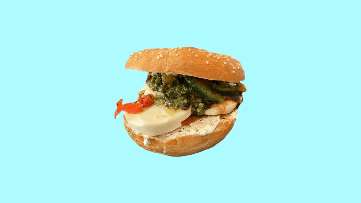 with cream cheese, tomato, mozzarella, lettuce, cucumber and pesto