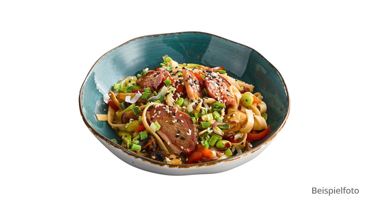 gebratene Reisnudeln mit Ei, gemischtem Gemüse und knuspriger Ente