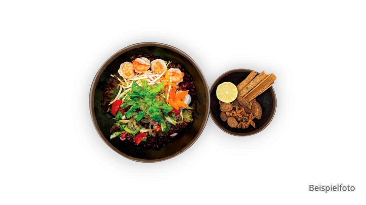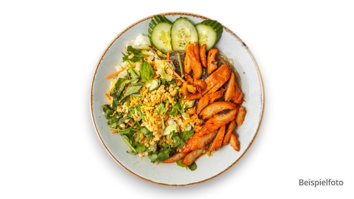 alle Gerichte werden mit Reisbandnudeln, frischem Salat, Gemüse und einem Dressing deiner Wahl zubereitet