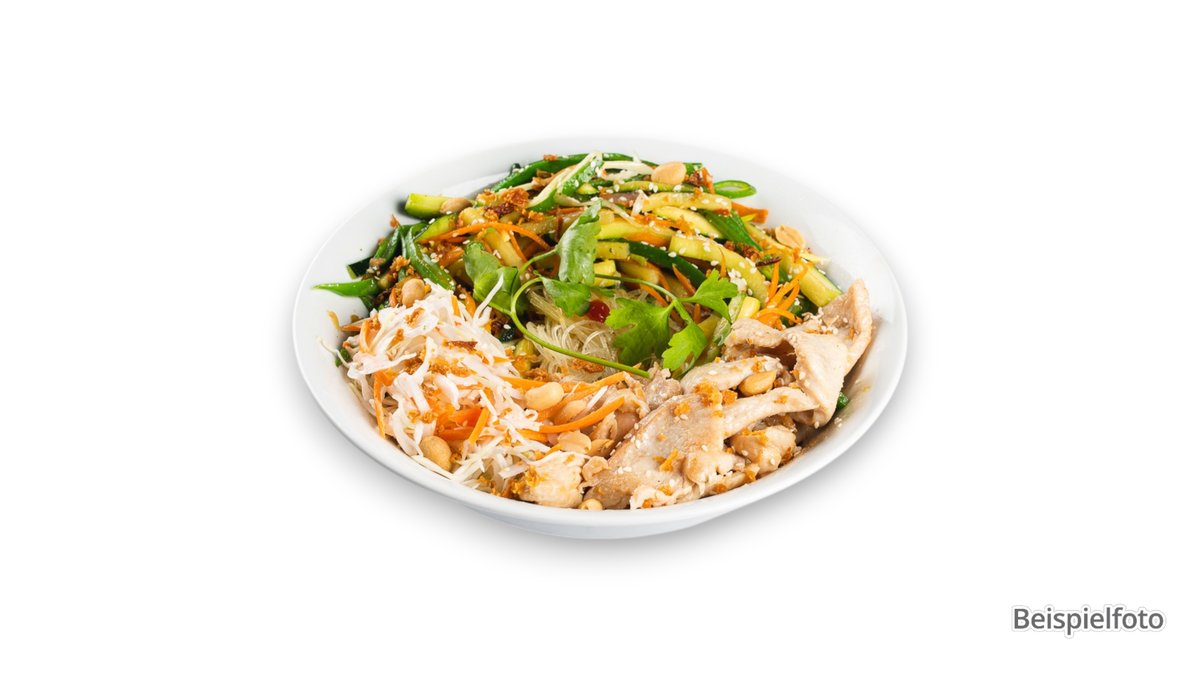 Reisbandnudelsalat mit Hähnchen, dazu eingelegtes Kohlrabi-Möhren Topping, Eisbergsalat, Gurke, Paprika, Mango, Erdnüssen und Koriander.