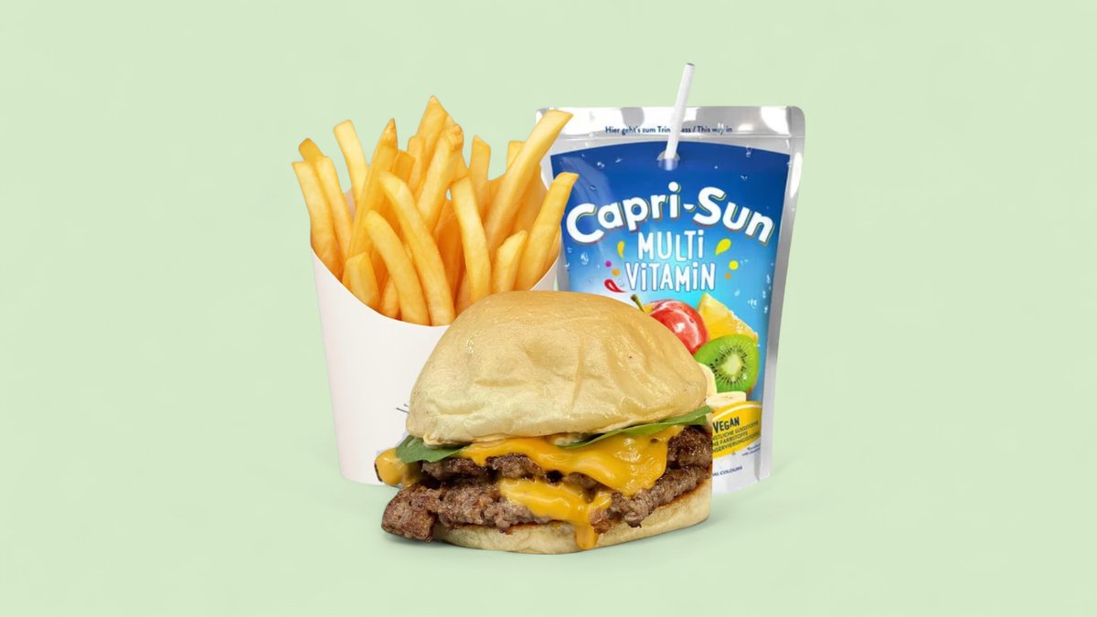 1x beef cheeseburger 1x French fries 1x capri-sun multivitamin 0.2l