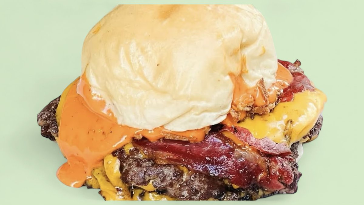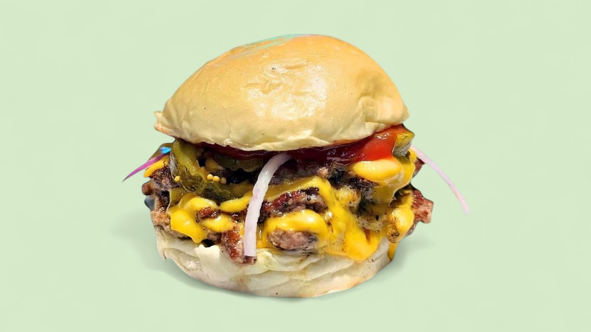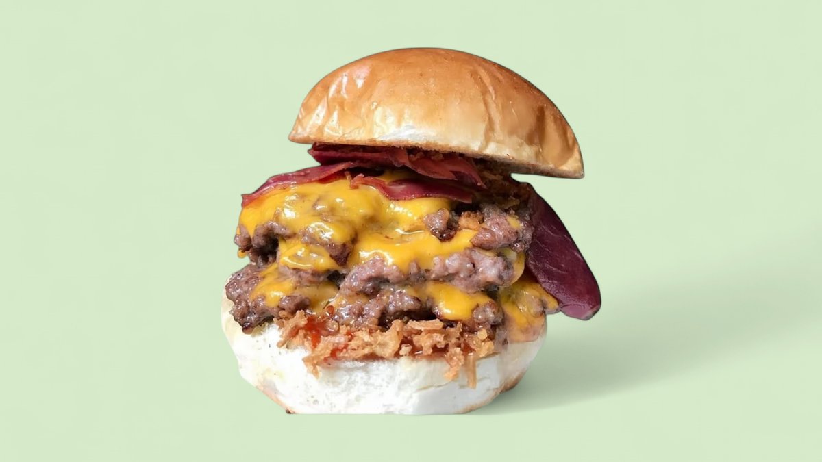 patty from a post-banade filled with vegetables, with double cheddar, fried onions and spicy BBQ special sauce