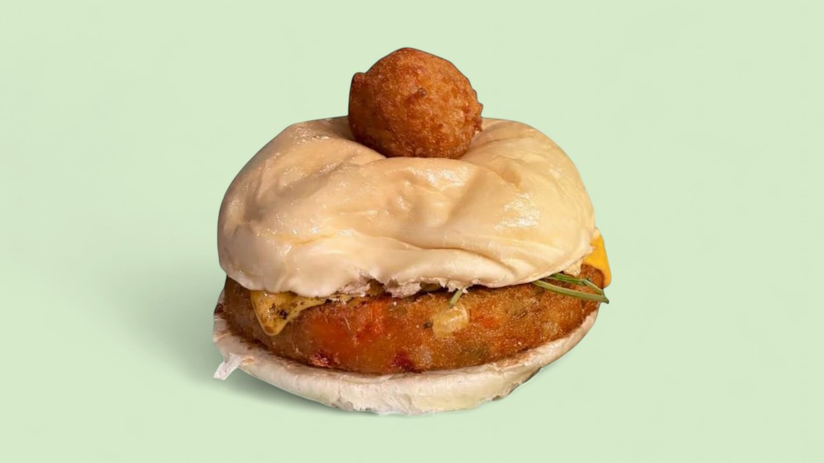 patty from a nacho breading filled with vegetables, with fried onions, rocket, double cheddar, cheese balls and arca special sauce