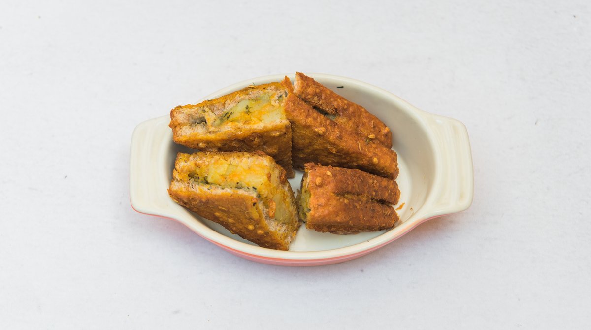 Buttertoast gefüllt mit Erbsen und Kartoffeln, frittiert in Kichererbsenmehl-Teig
