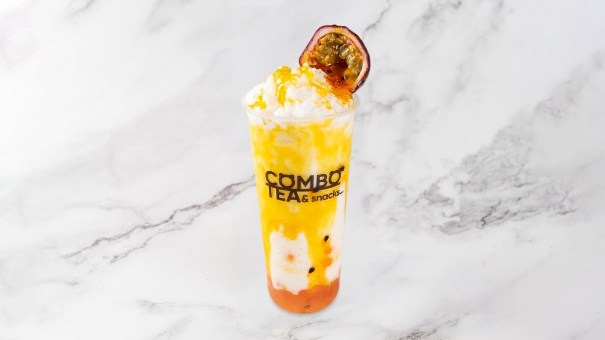 Maracuja Joghurtgetränk mit einem Topping deiner Wahl