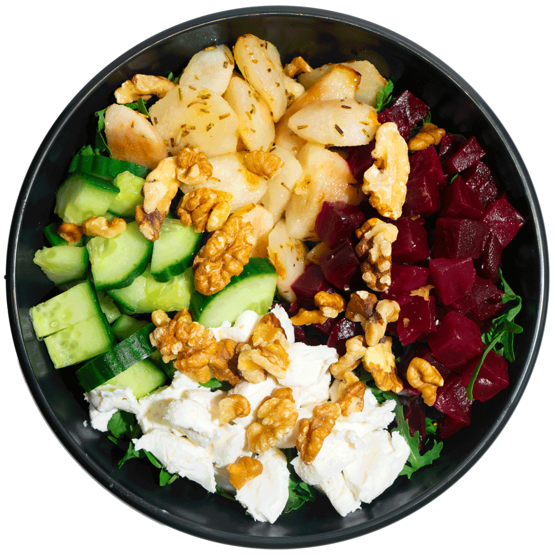 mit Ziegenkäse, eingelegter Rote Beete, Rosmarin-Birnen, Gurken, Walnüssen, Belugalinse, Rucola und einem Dressing deiner Wahl