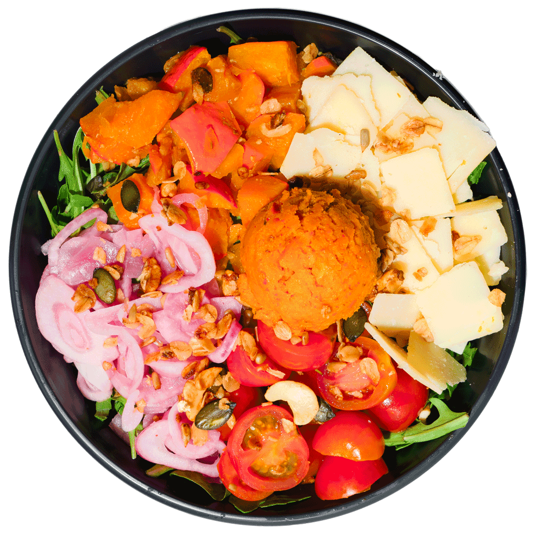 mit gebackenem Kürbis, eingelegten roten Zwiebeln, italienischer Hartkäse, Kirschtomaten, Rucola, pikantem Granola, Rigatoni-Pasta, Kürbis-Chili Dip und einem Dressing deiner Wahl