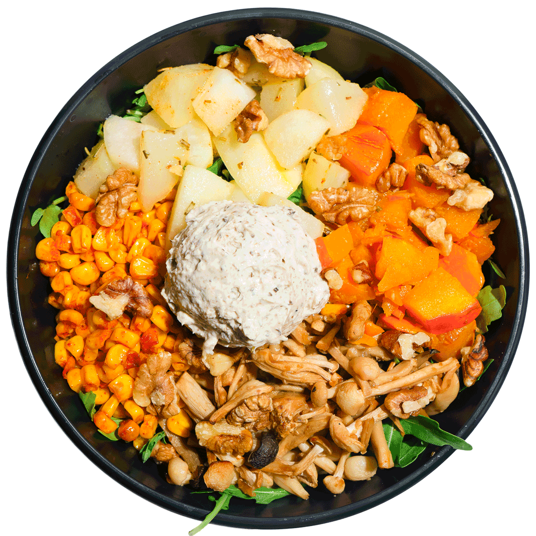 mit Trüffelcreme, Miso-Buchenpilzen, gebackenem Kürbis, geräuchertem Mais, Rosmarin-Birnen, Walnüssen, geröstete Rosmarin-Kartoffel, Rucola und einem Dressing deiner Wahl