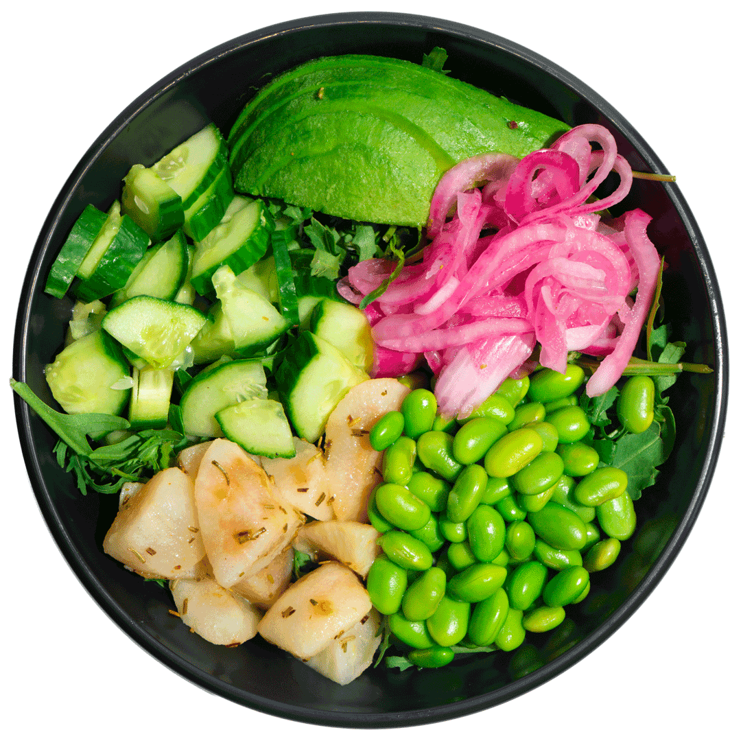 mit Avocado, Edamame, gerösteten Erdnüssen, Rosmarin-Birnen, Gurken, eingelegten roten Zwiebeln, Rucola und Basmatireis