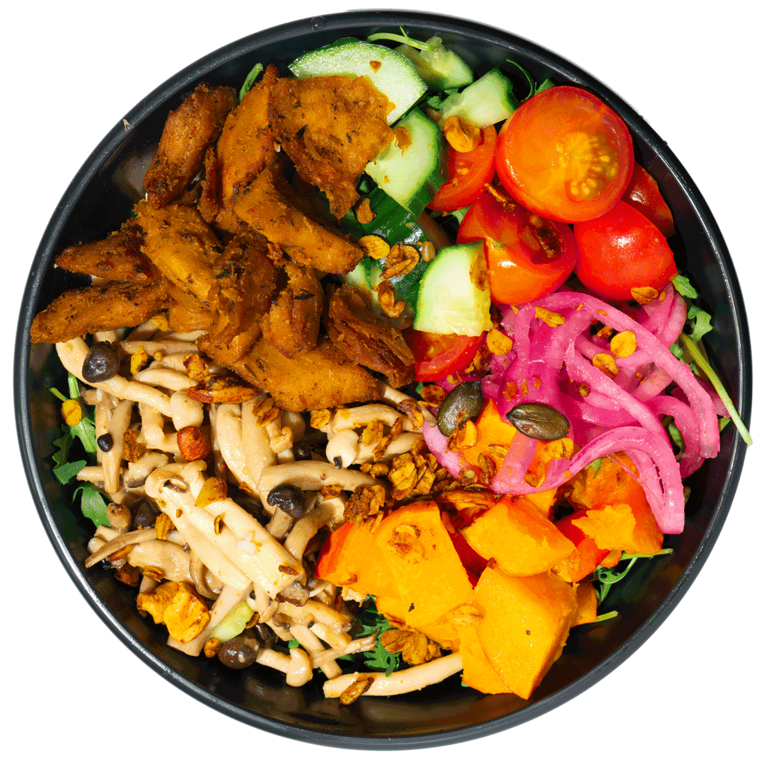 mit planted.chicken, gebackenem Kürbis, Miso-Buchenpilzen, Gurken, eingelegten roten Zwiebeln, Kirschtomaten, Rucola, Basmatireis und pikantem Granola