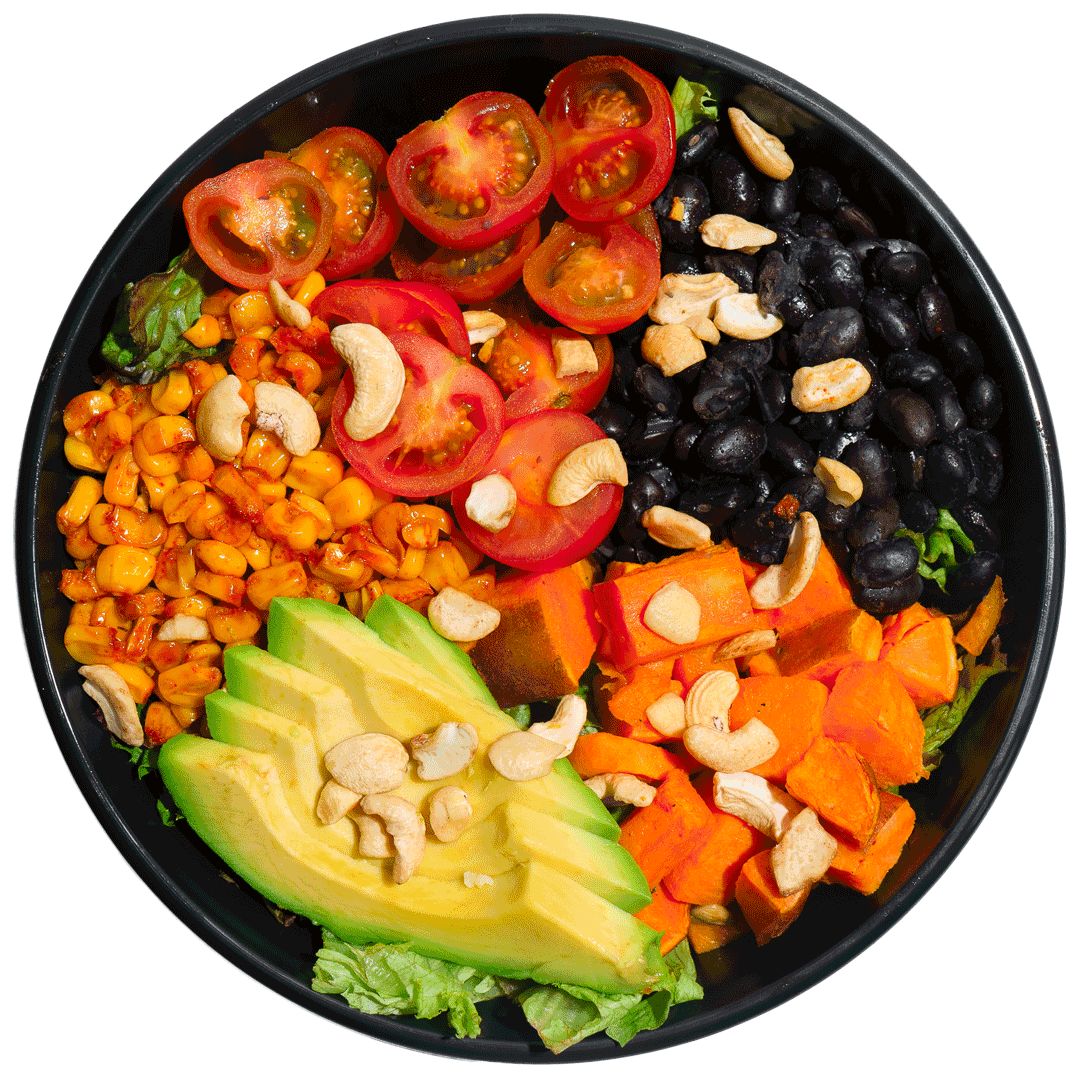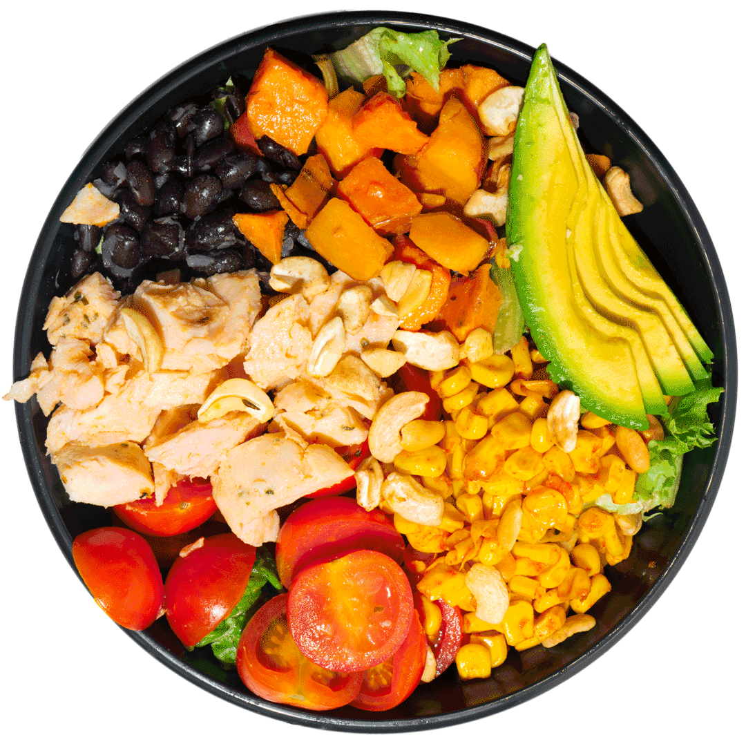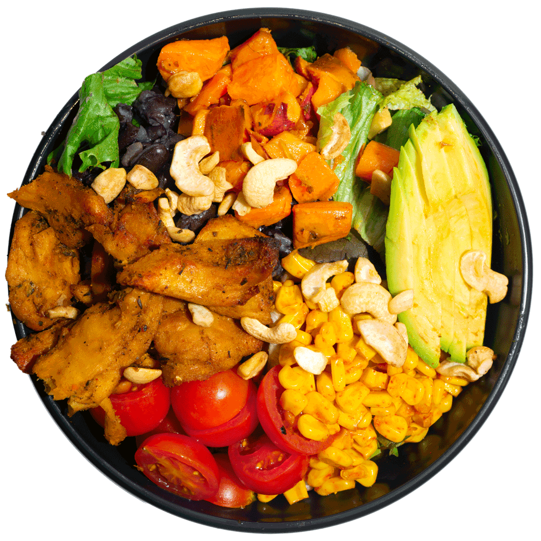 mit Hähnchen-Sous-Vide, Avocado, geräuchertem Mais, gerösteten Süßkartoffeln, schwarzen Bohnen, Kirschtomaten, Kaschunüssen, Basmatireis und gemischtem Blattsalat