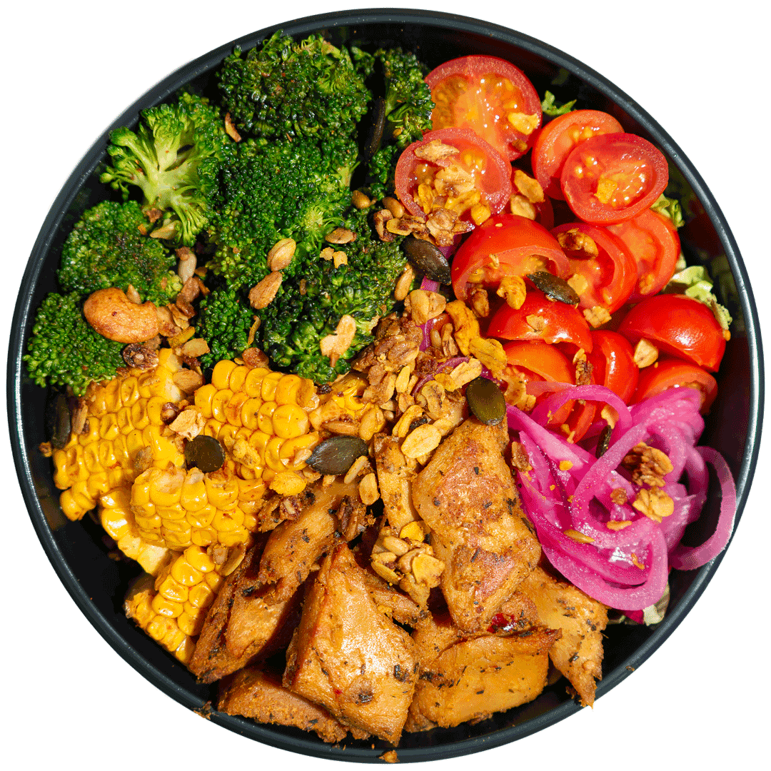 mit planted.chicken, Cajun-Brokkoli, eingelegten roten Zwiebeln, geräuchertem Mais, Kirschtomaten, pikantem Granola, gerösteten Rosmarin-Kartoffeln und gemischtem Blattsalat