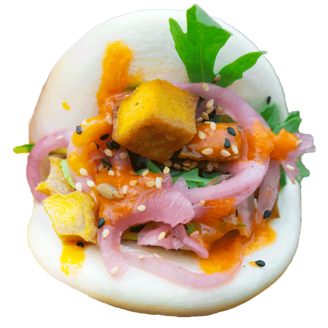 mit Bao Bun, Tofu, Rucola, eingelegten roten Zwiebeln und Kimchi-Tomato-Dressing