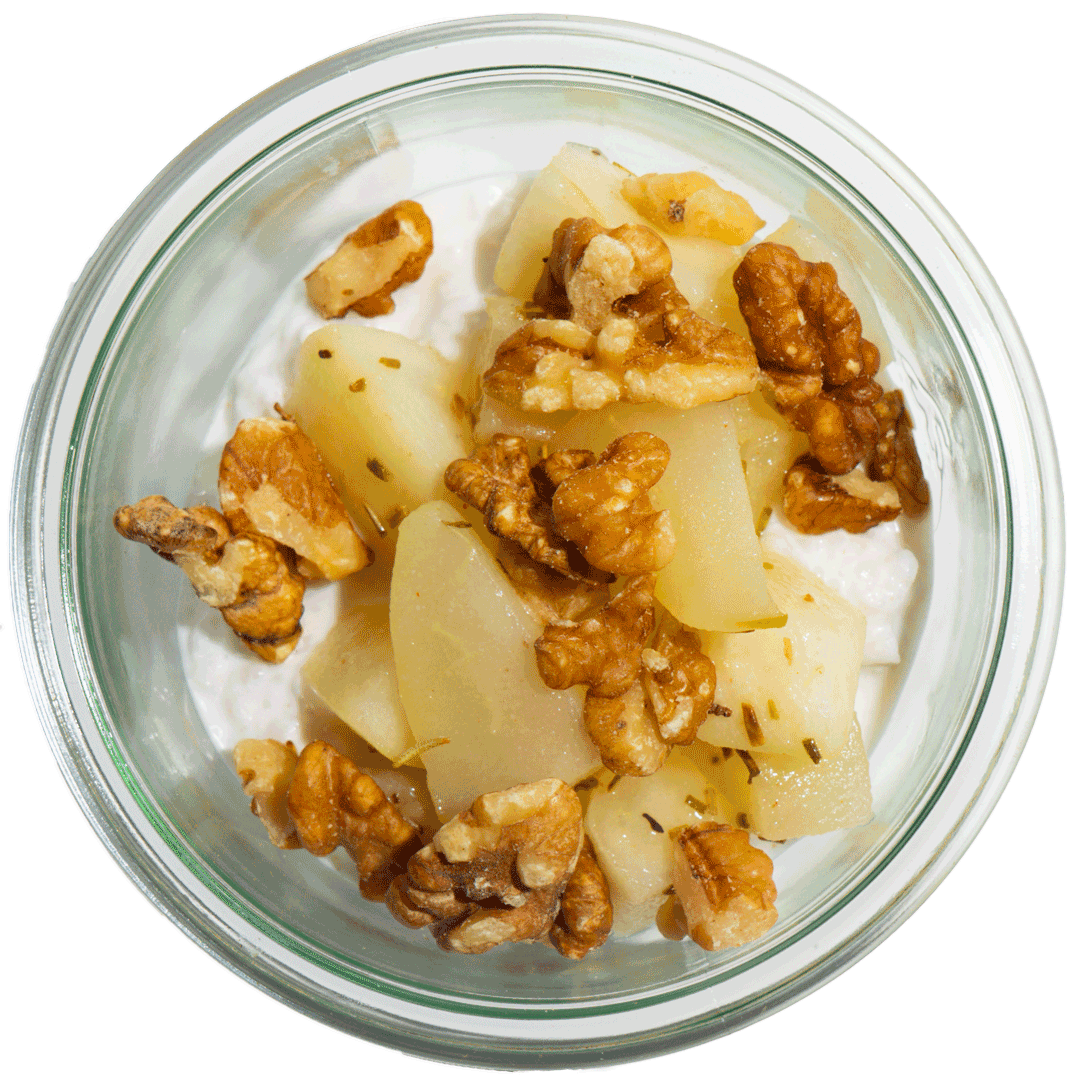 mit Kokosmilchreis, Birnen und Walnüssen