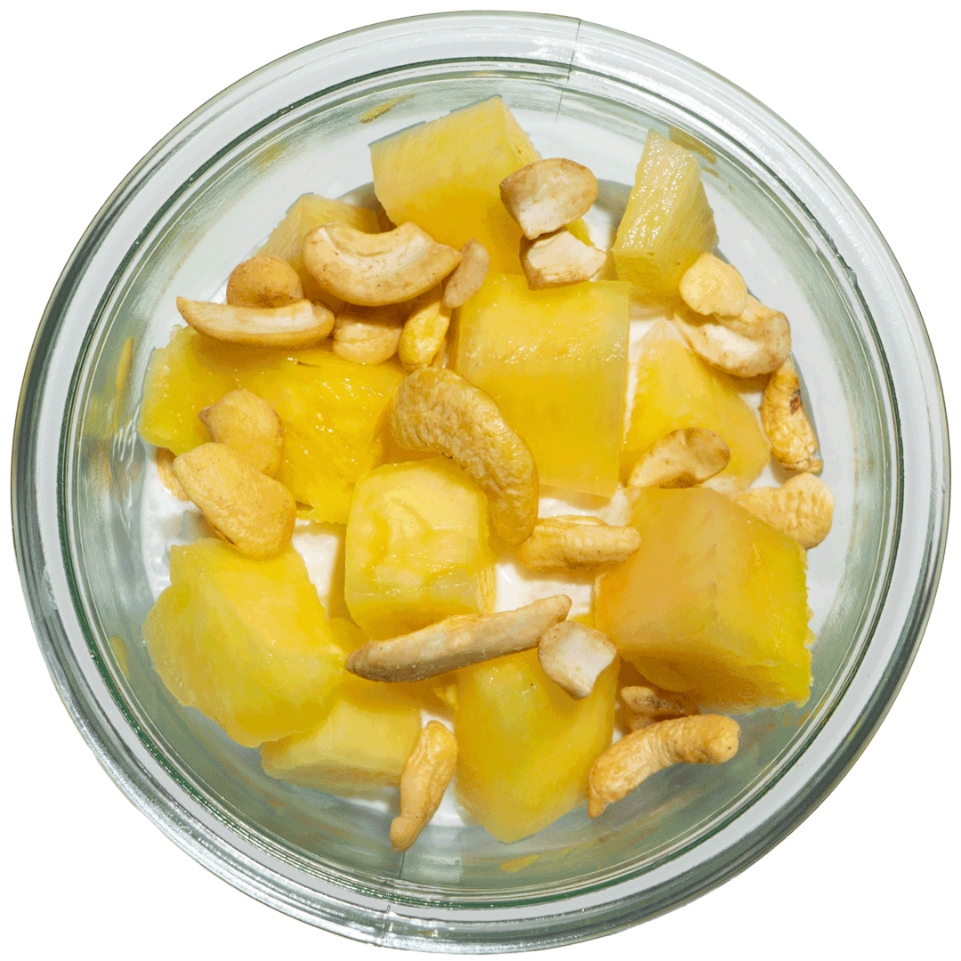 mit Kokosmilchreis, Ananas und Kaschunüssen