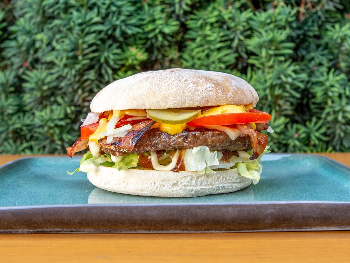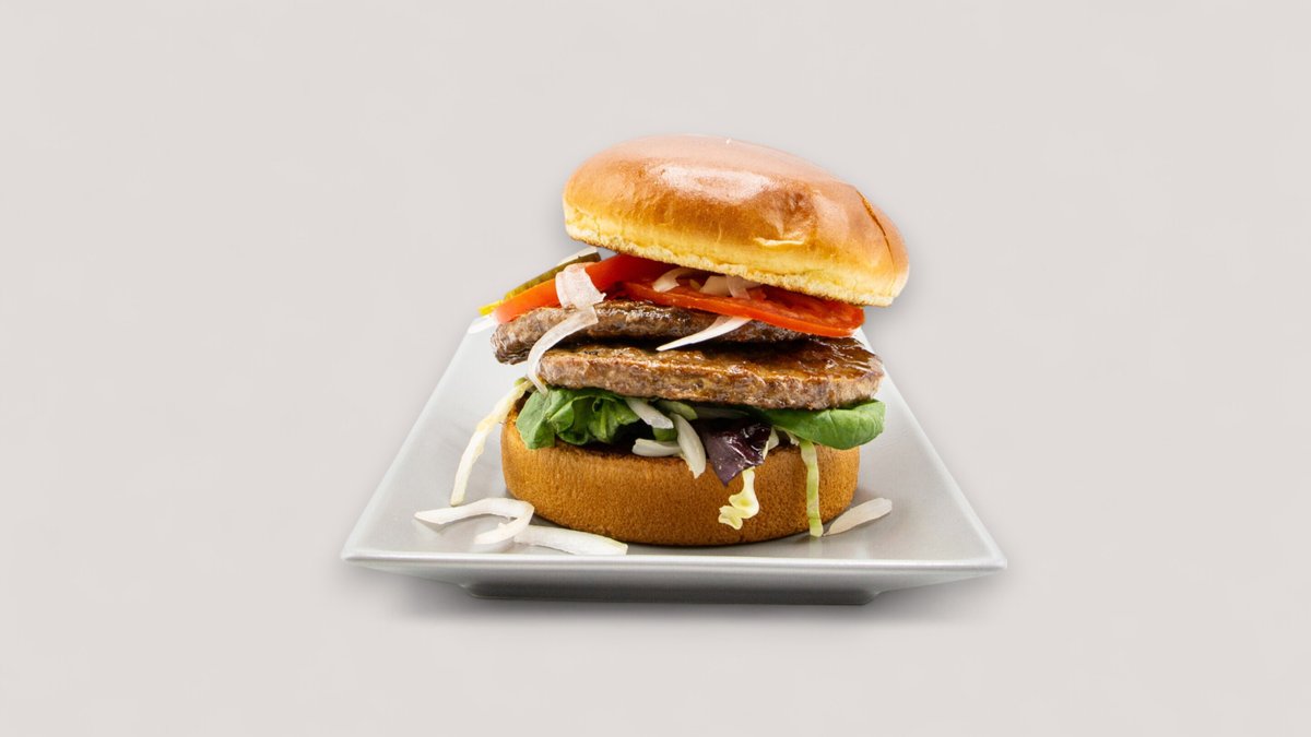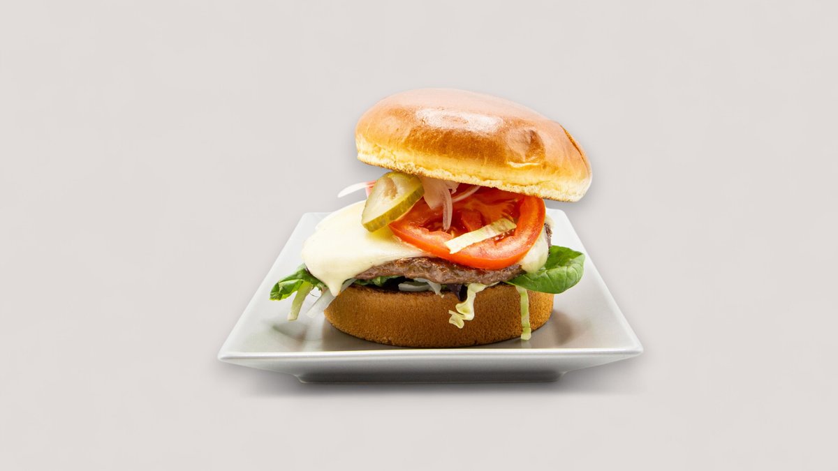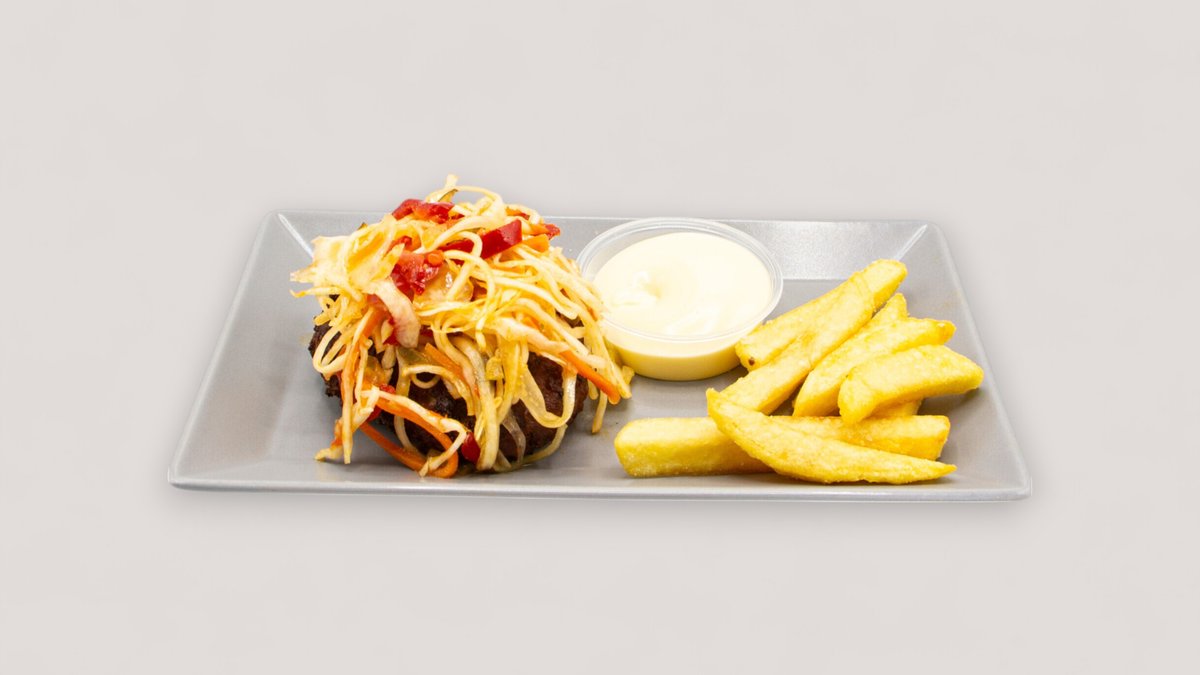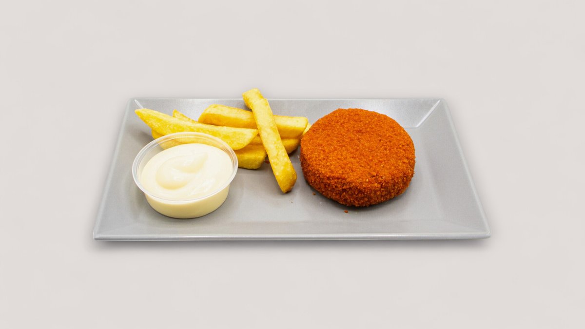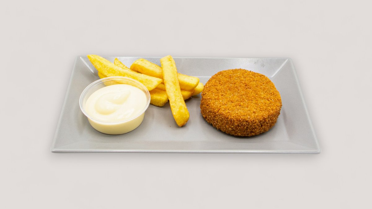mit 130 g Gemüsepatty, Brioche-Bun, Eisbergsalat, Zwiebeln, Gurken, Mayonnaise und Joppiesoße