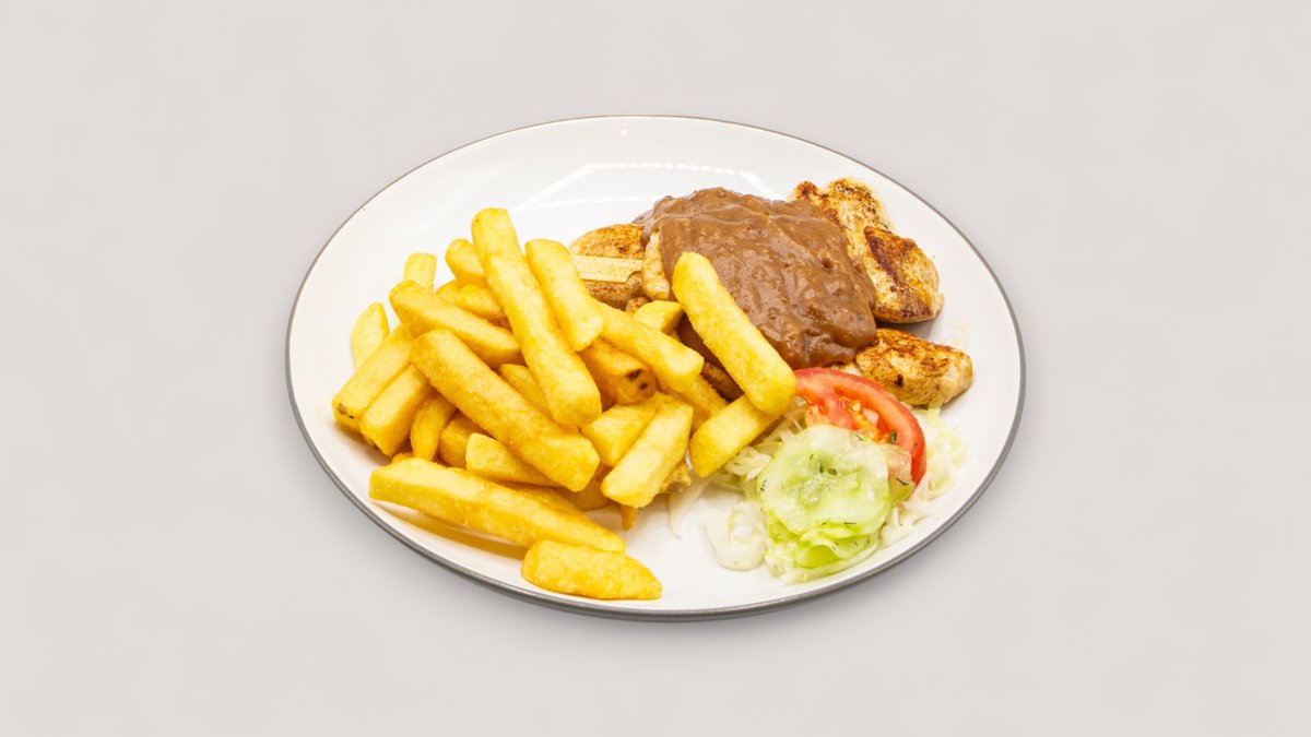 3 Stück hausgemachte Hähnchenfleisch-Spieße mit Erdnusssoße und Pommes frites