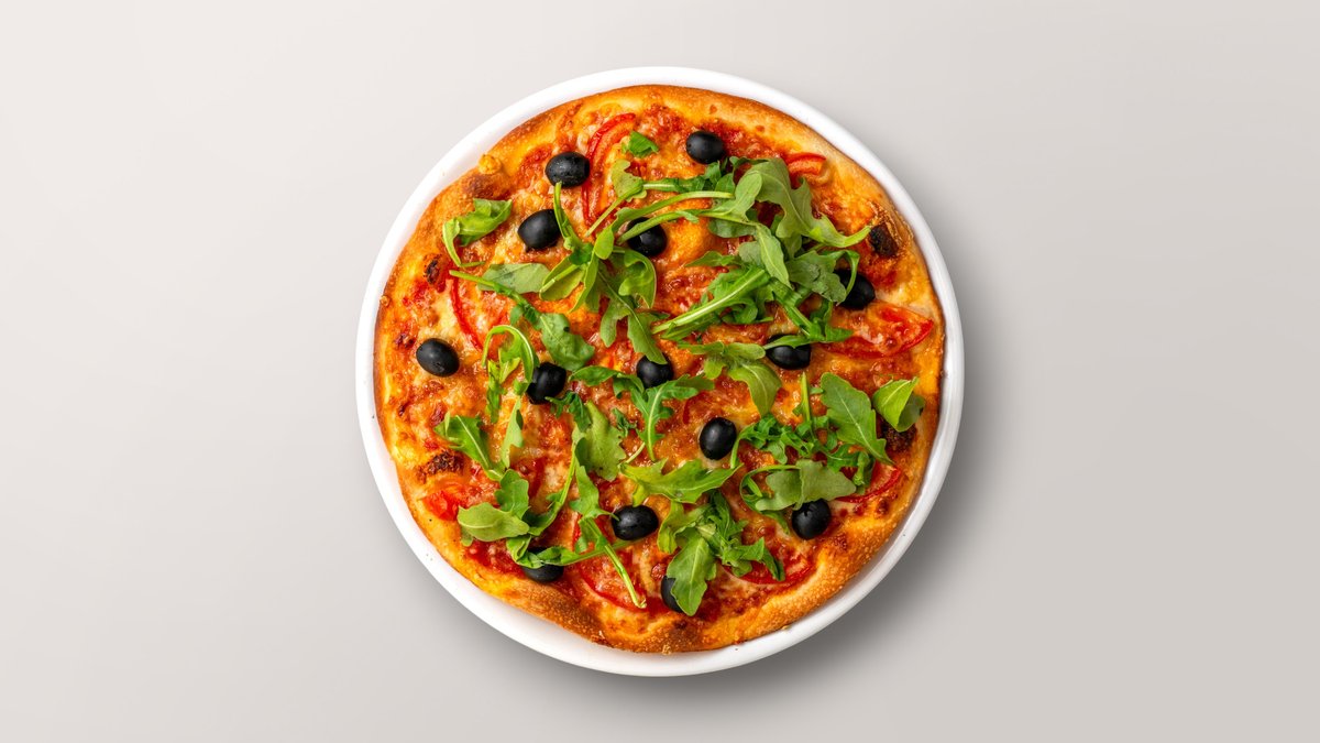 mit Tomaten, Mozzarella, Oliven und Rucola