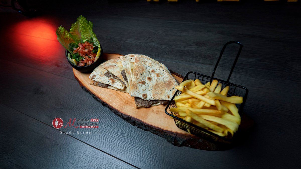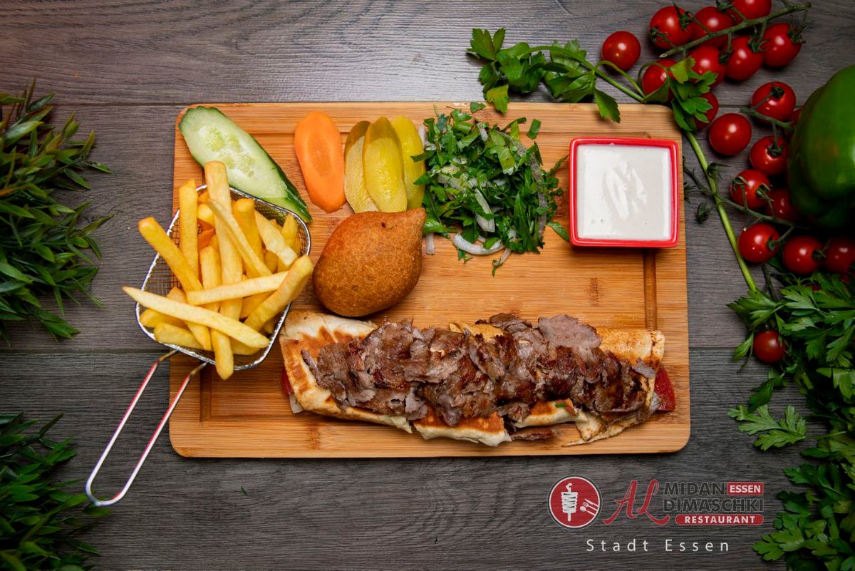mit geschnittenem Schawarma-Sandwich, Pommes Frites, Salat, Gurken und 1 Kibbeh-Hühnerknödel