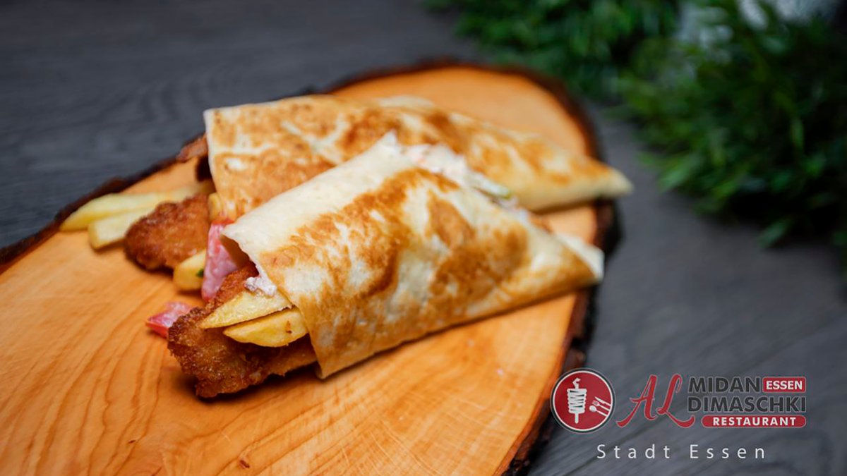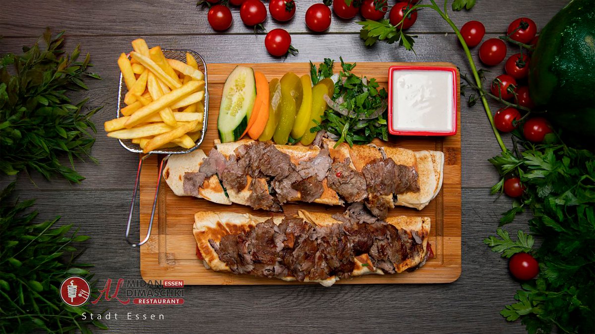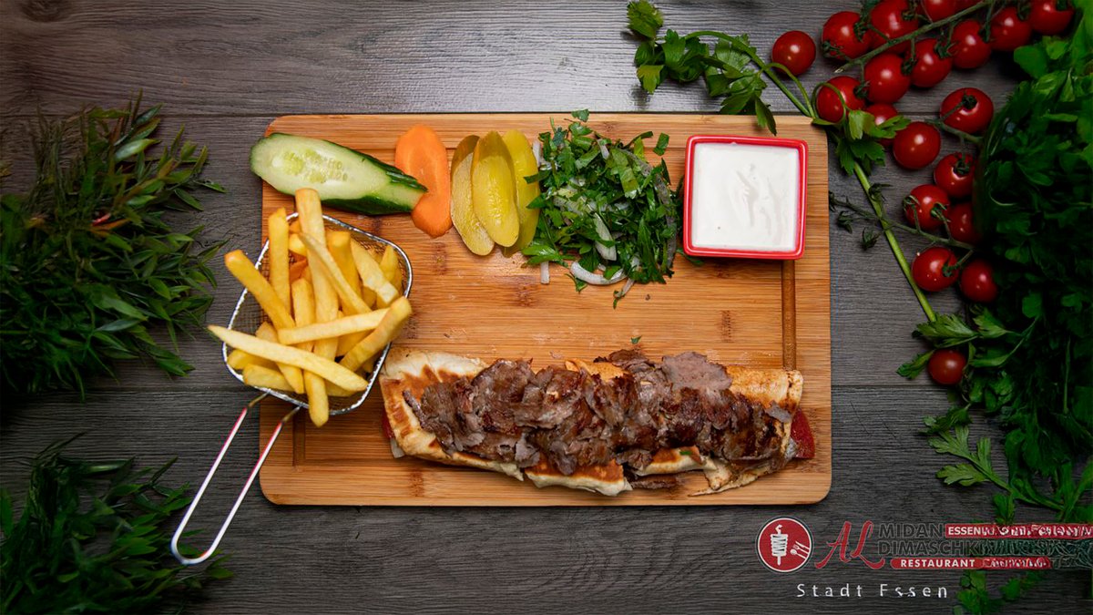 mit 2 geschnittenen Schawarma-Sandwiches, Pommes frites, Salat, Gewürzgurken und Soße