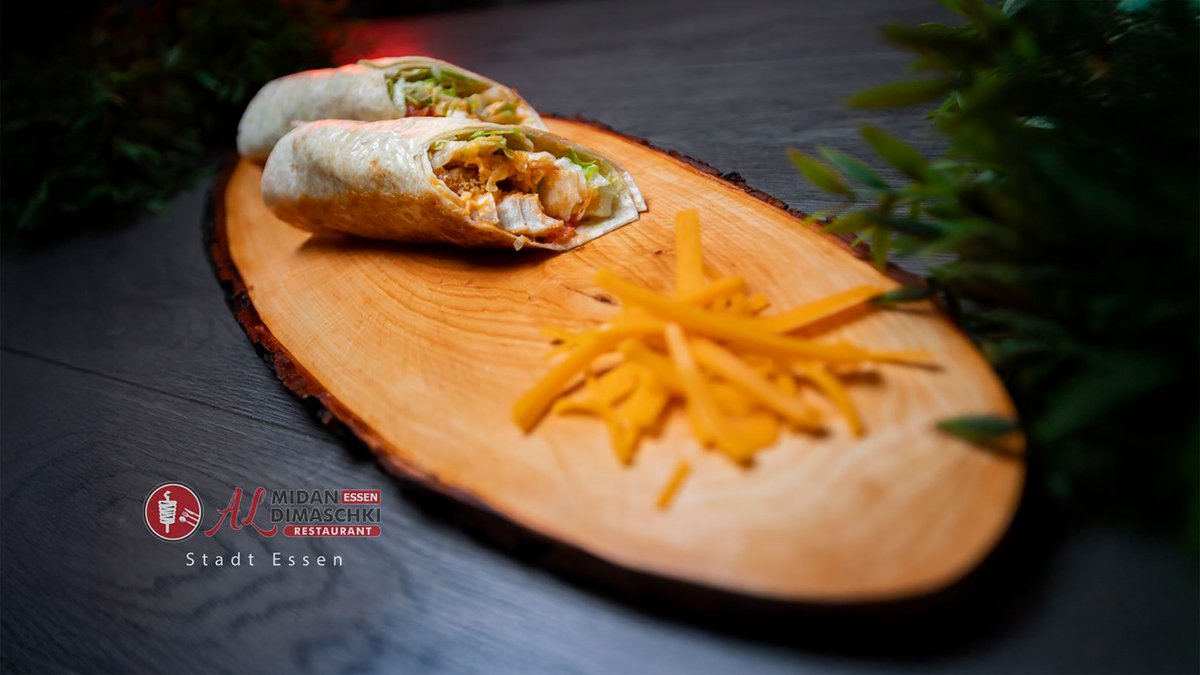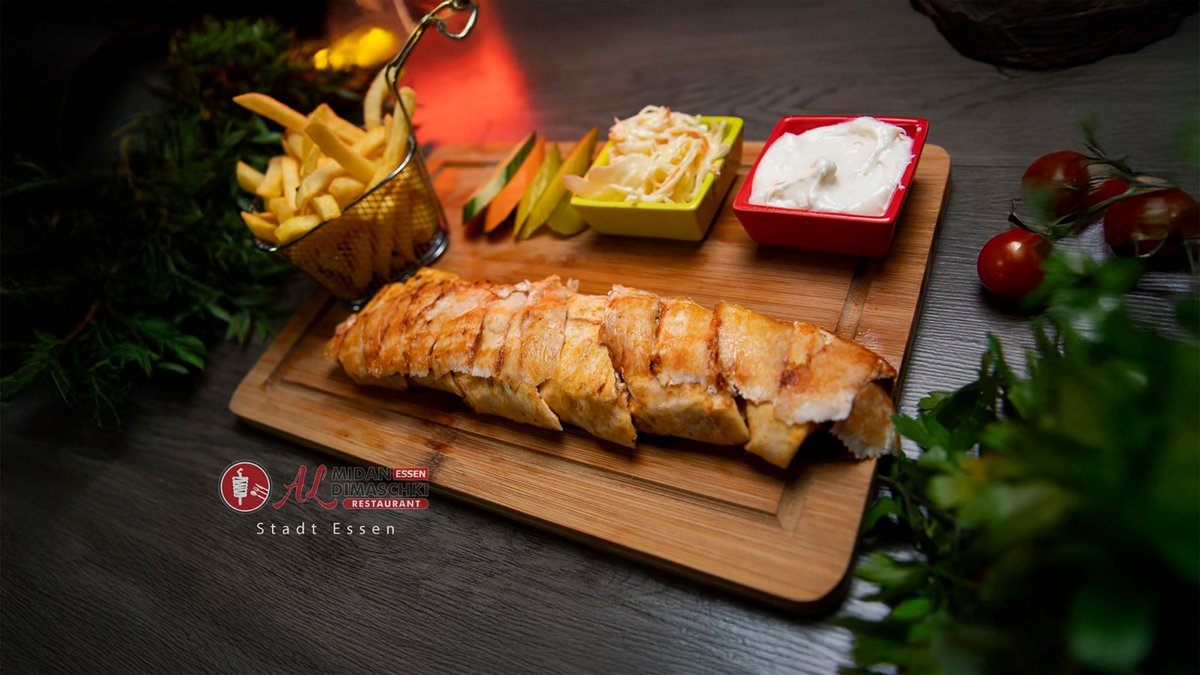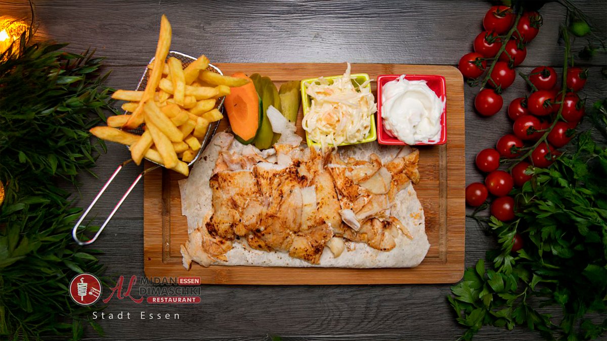 mit 4 kleinen Schawarma-Rollen, Knoblauchsoße, Pommes frites, Salat und Gewürzgurken