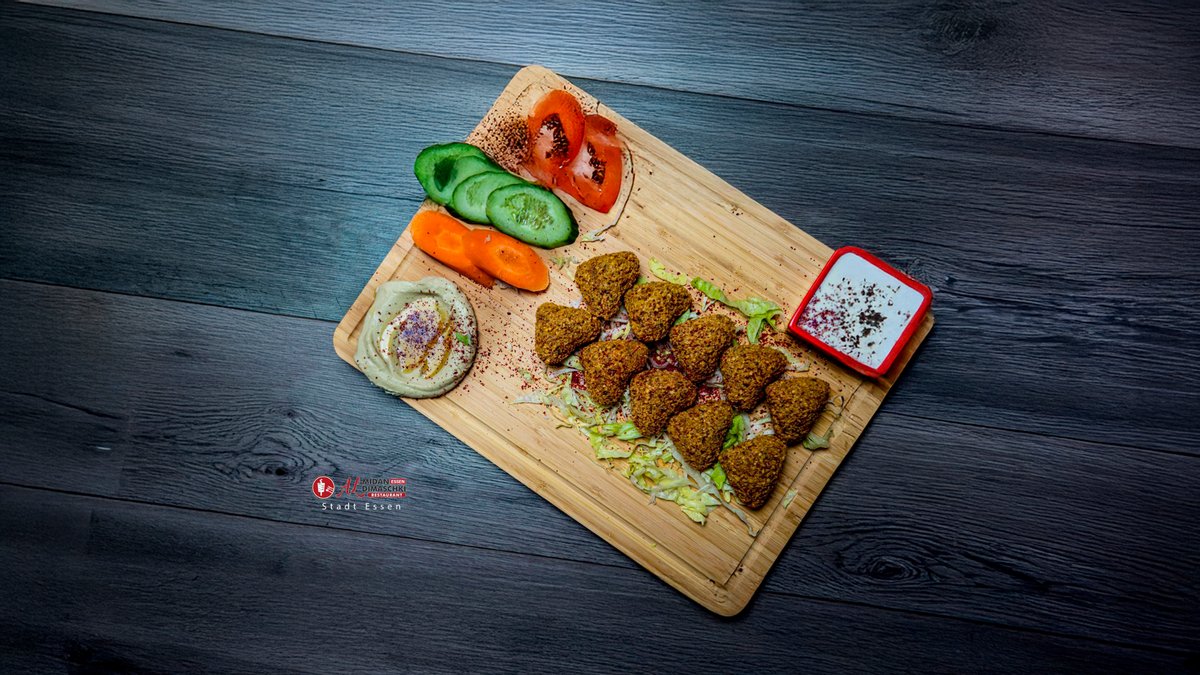 10 Stück mit frittierten, pürierten Kichererbsen, Blattsalat und Tomaten